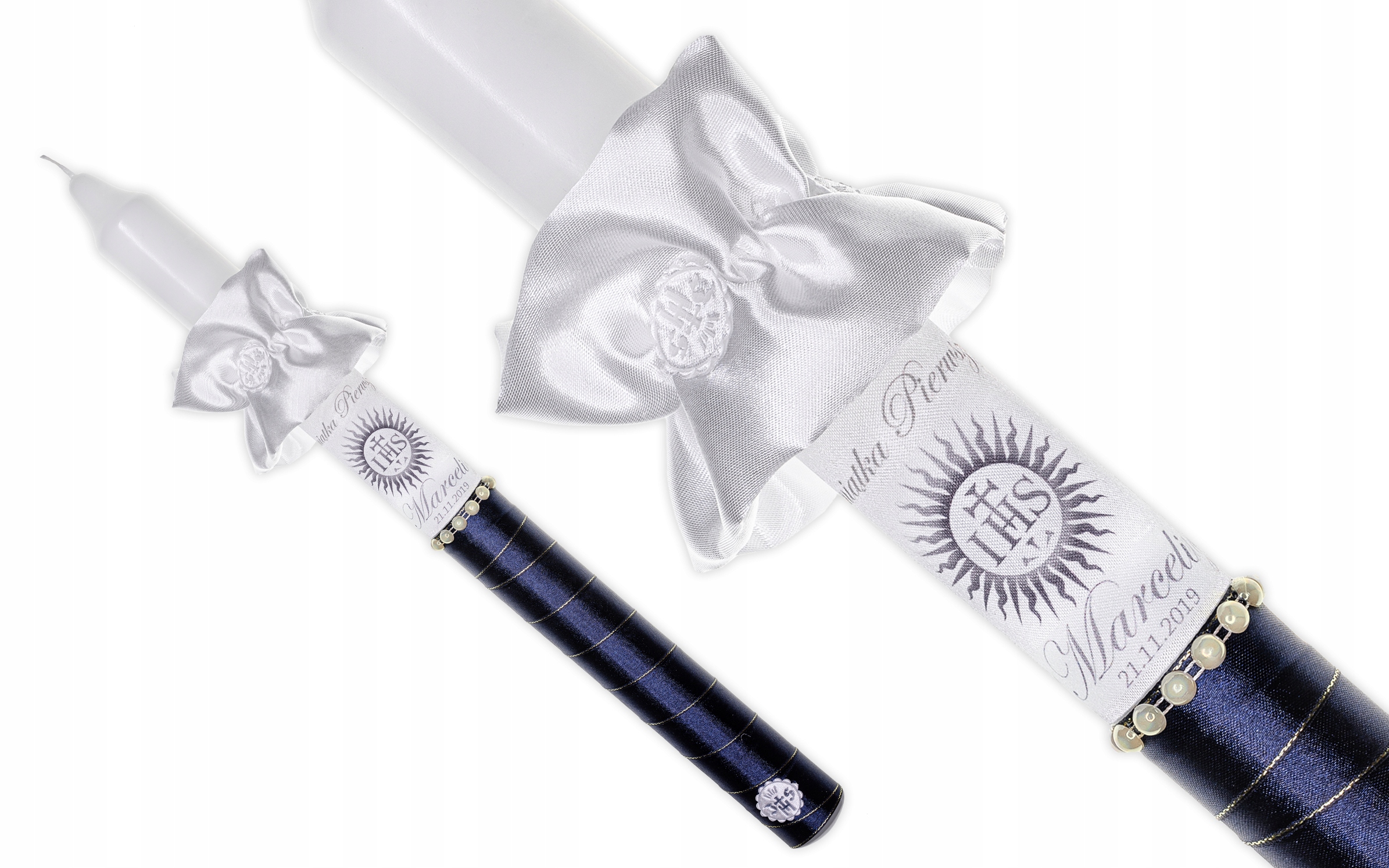 – це свічка, оформлена темно-синім і золотистим атласом із додаванням кремових перлів і білою аплікацією з символом IHS, що надає елегантності та простоти. підкреслюючи церемонію Першого Святого Причастя.