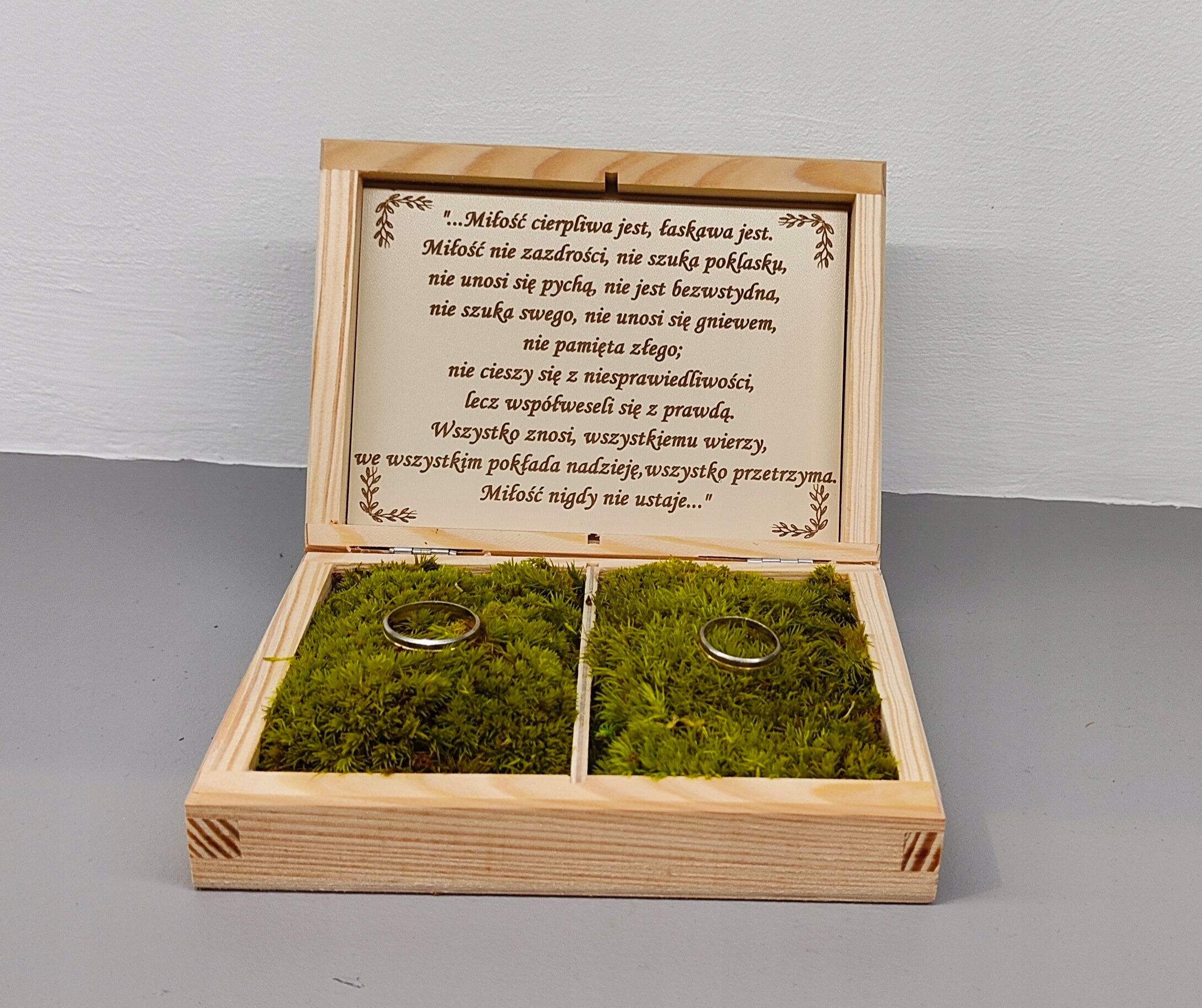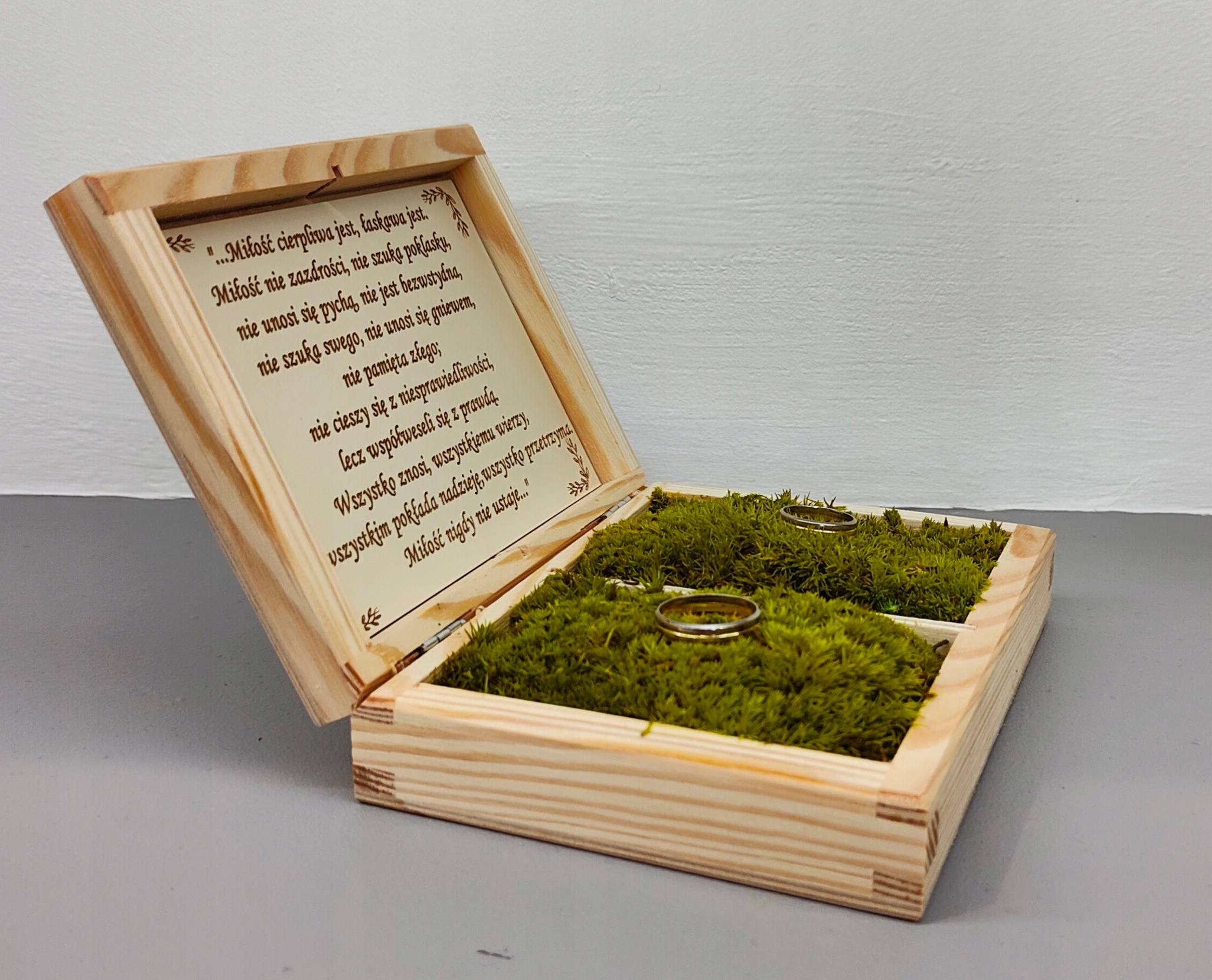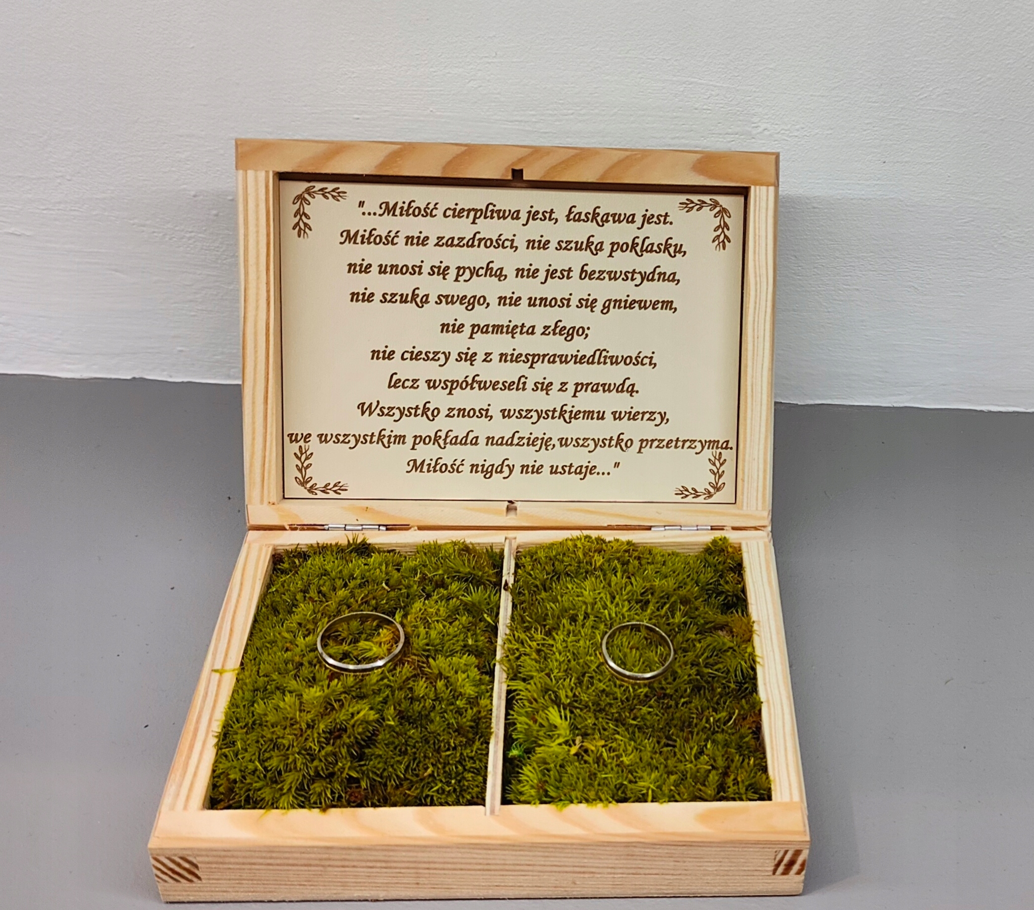 посередині коробки мають 2 камери, наповнені стабілізованим мохом подушкою. Покладіть свої обручки на цій м'якій подушці. Під кришкою є речення - гімн про любов.