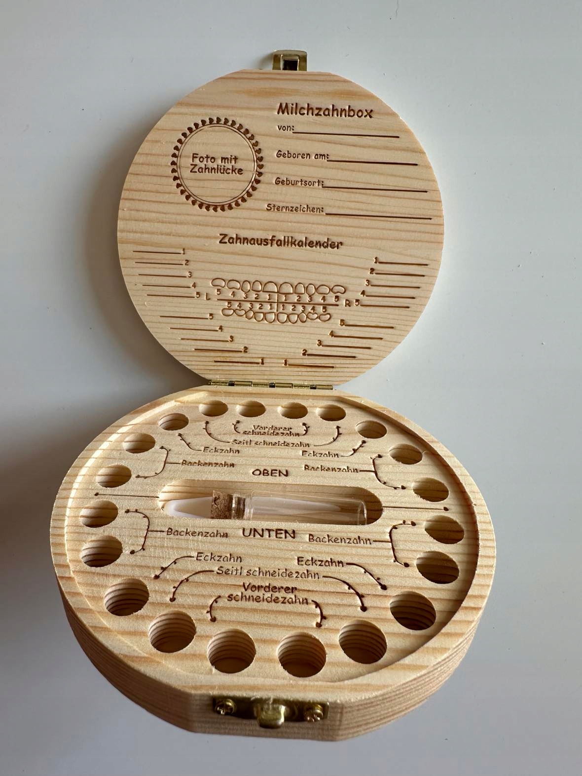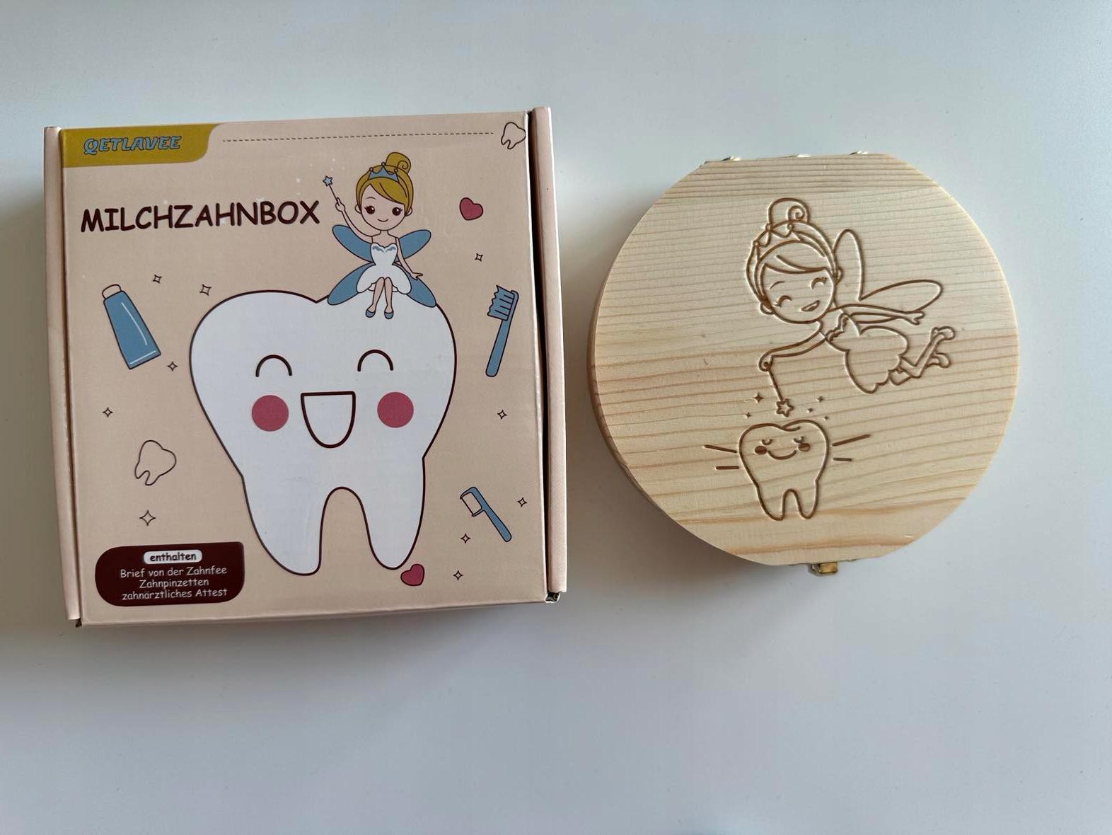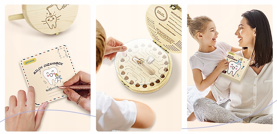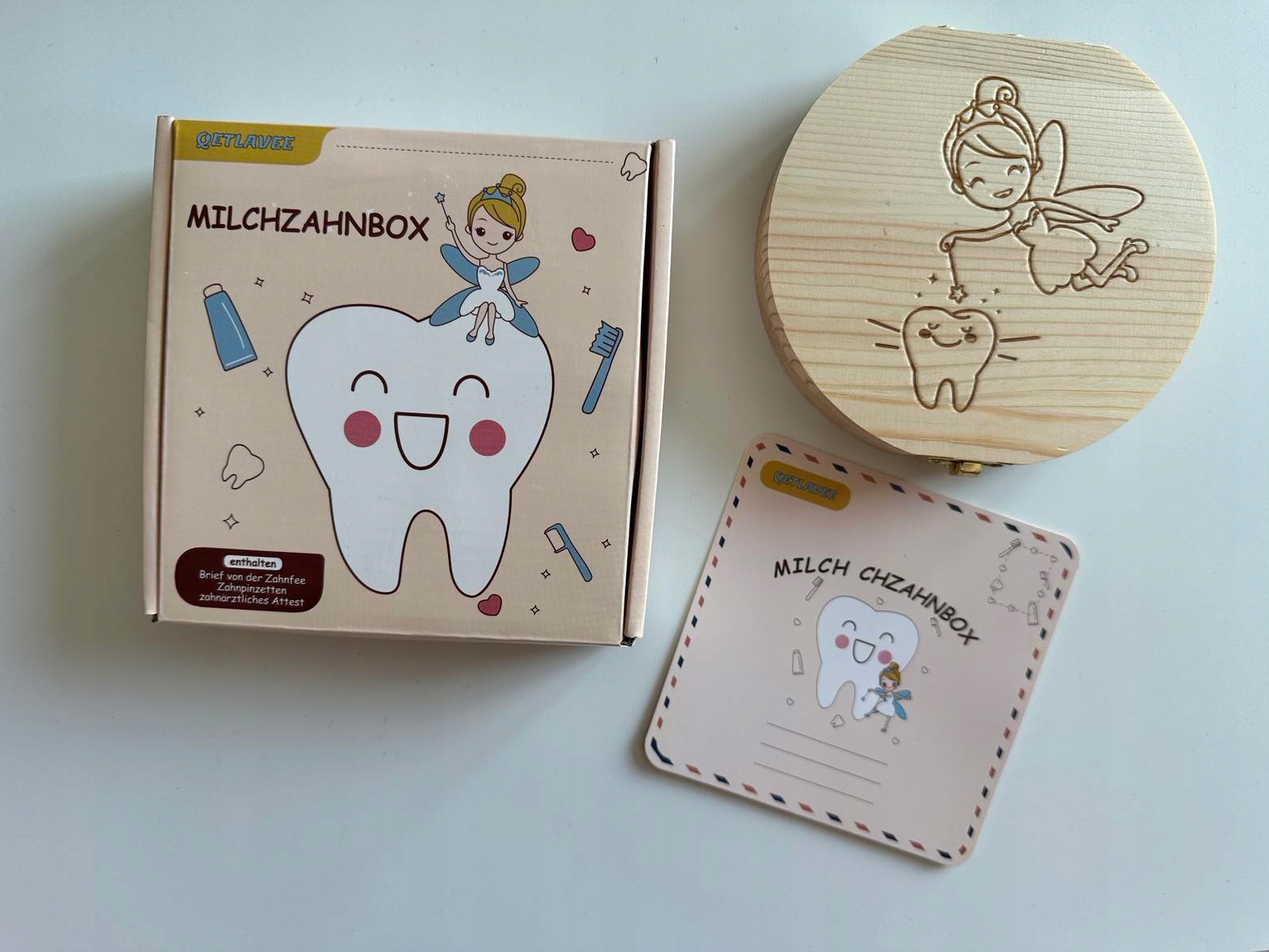 Кожен зуб має своє місце з етикеткою німецькою мовою в цій ретельно розробленій коробці для молочних зубів. Крім зберігання молочних зубів, ця коробочка може бути і подарунком на пам'ять. Незалежно від того, запросили ви в гості або організували хрещення малюка, коробочка для молочних зубів завжди буде прийнята в якості подарунка. Підійде як ідеальний подарунок на Різдво, Великдень, день народження.