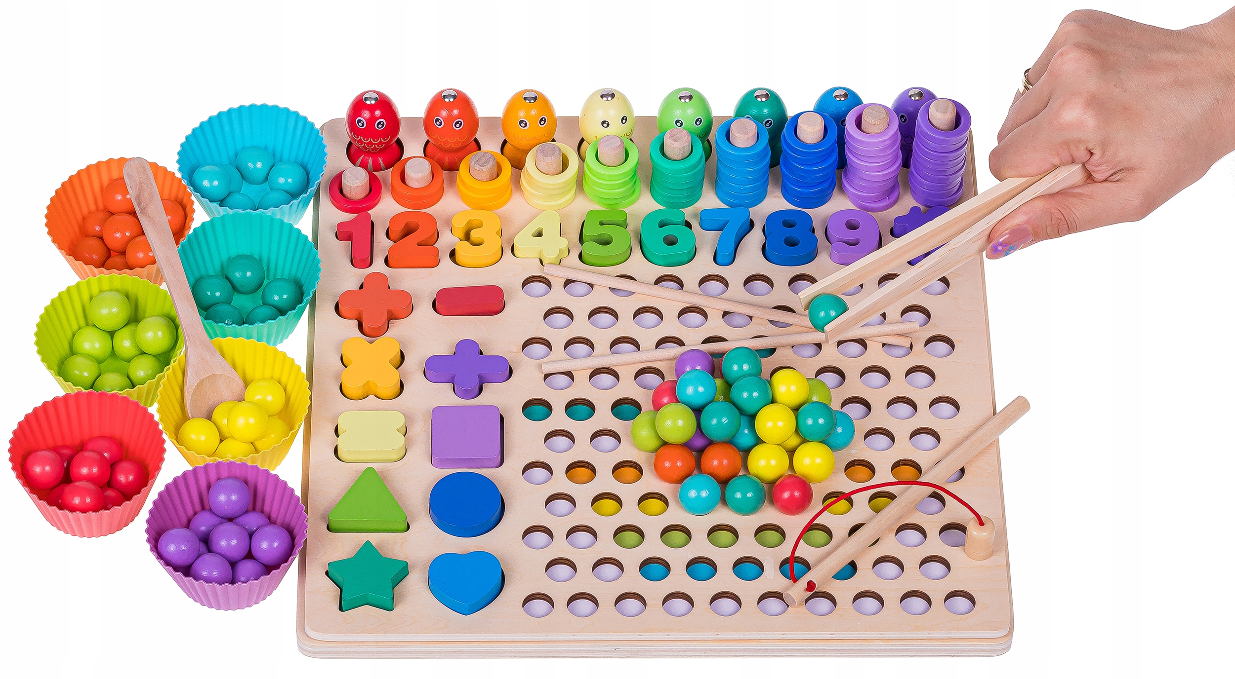 Дерев'яна логарифмічна дошка Монтессорі XXL - це іграшка, завдяки якій дитина розвиває моторику та когнітивні навички. Іграшка допомагає дітям навчитися розпізнавати кольори, форми та цифри.