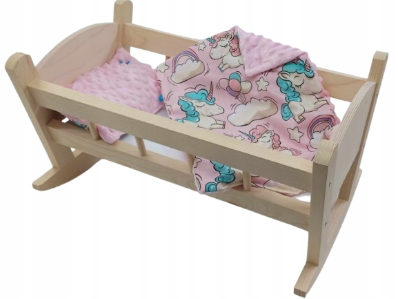 Чудова дерев'яна колиска для ляльок, виготовлена зі смерекової деревини.