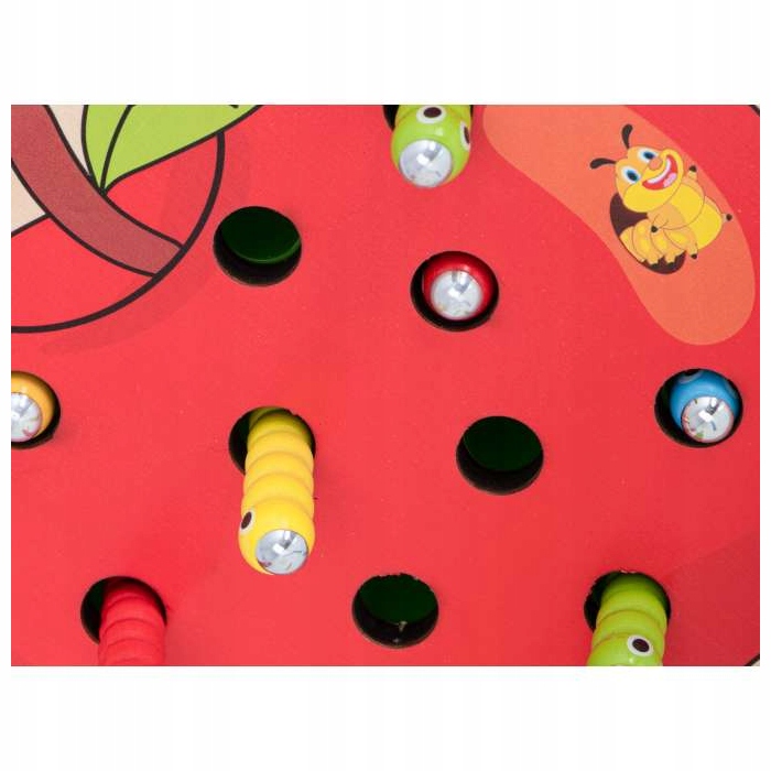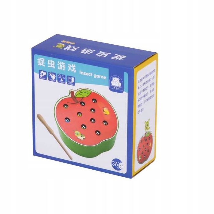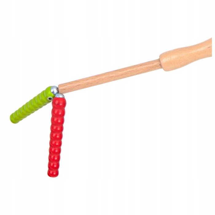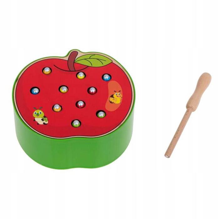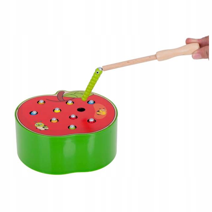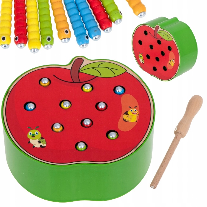 У набір входить основа у формі яблука з 10 різнокольоровими гусеницями. зроблена з дерева та металу та дерев'яна паличка з магнітом на кінці.