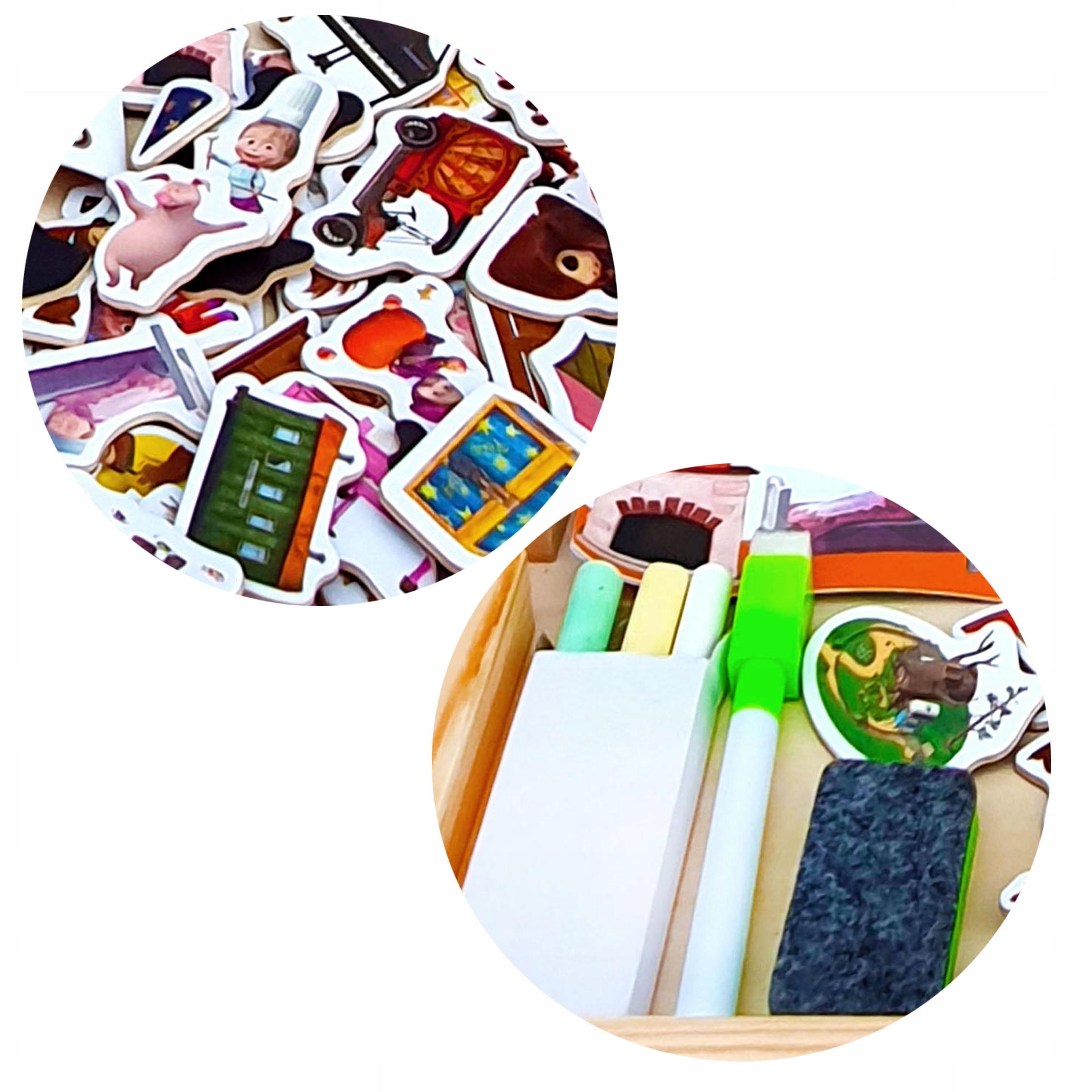 У набір входять барвисті магнітні пазли, з яких можна створювати дивовижні малюнки на дошці