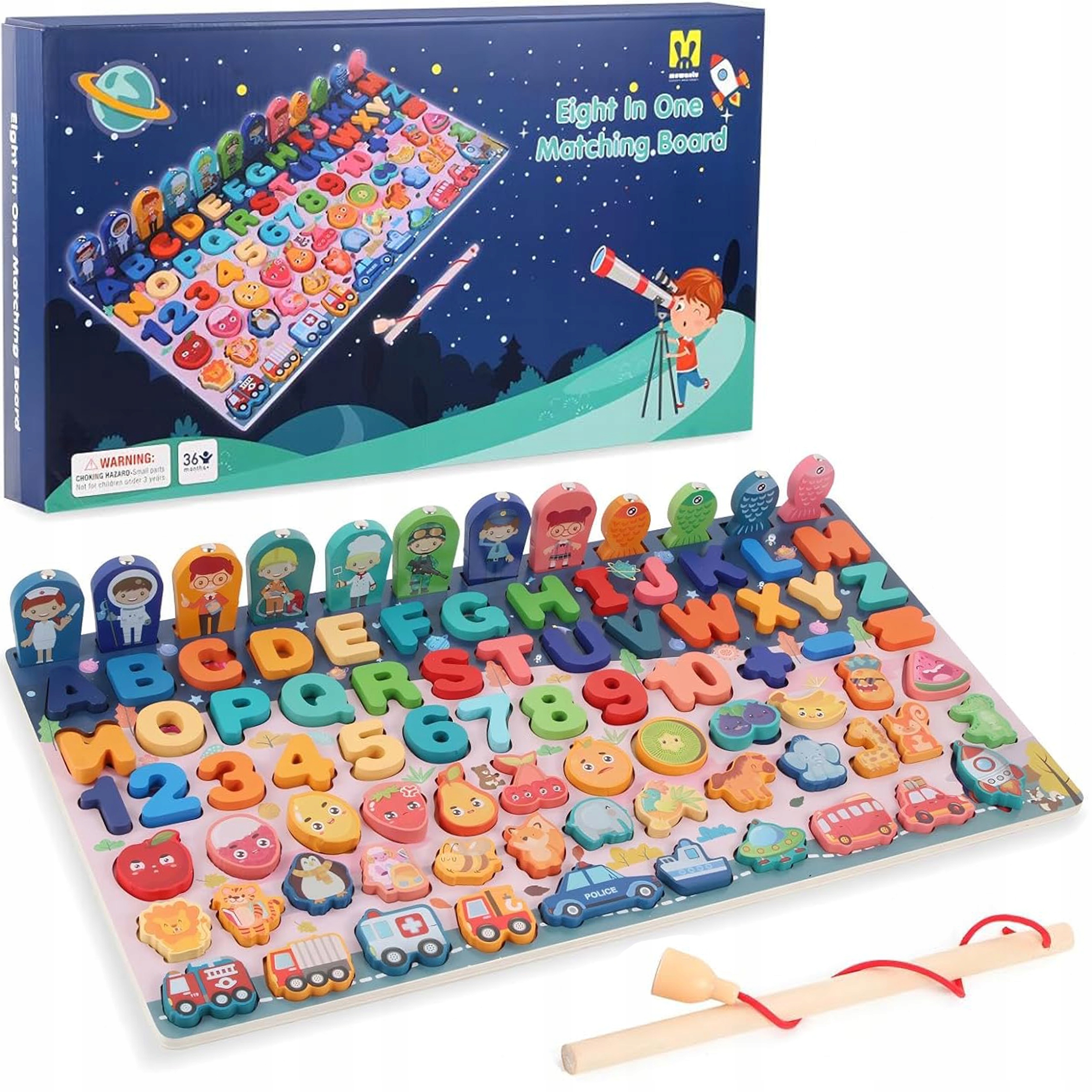 Кожна з 12 фігурок (4 рибки та 8 символів) має кінець магніту, тому їх можна зняти з дошка b> з вудкою, яка також входить в набір. Діти люблять цю забаву і також розвивають їхні навички вручну.