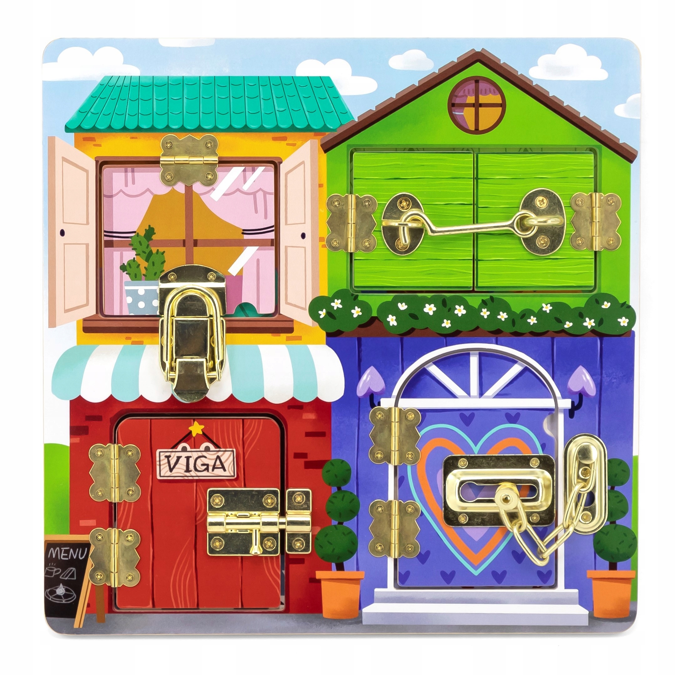 Дошка складається здерев'яної дошкита 4 дверей, закритих засувами та замками, на яких можна практикувати ручні навички.Дошка формує не лише базові навички, а йоко-руку координаціяіспритність пальців дитини.
