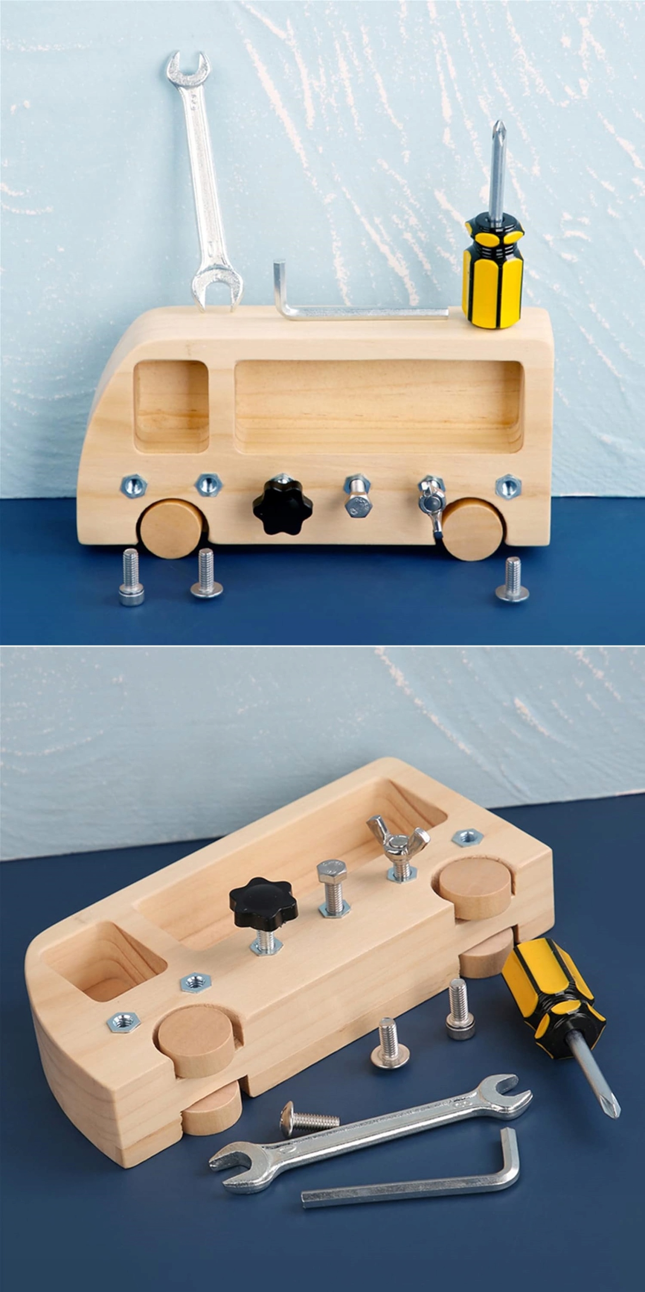 Гвинтовий автобус Монтессорі - це не тільки весело, але й розвиває моторику, координацію очей і рук і творчі здібності вашої дитини. Це екологічно чиста іграшка, яка не містить шкідливого пластику, подбайте про навколишнє середовище разом з нами!