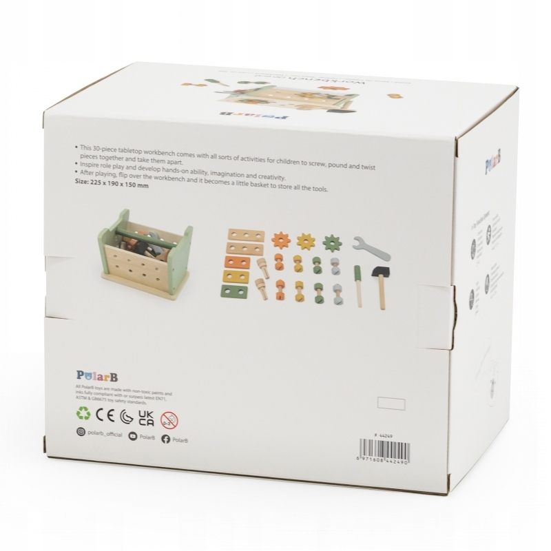 - Міні-дерев’яний ящик для інструментів для майстерень від бренду Viga з колекції PolarB подарує чудову розвагу кожному маленькому любителю саморобки. У набір входить молоток, гайковий ключ, викрутка, 4 пари гвинтів і гайок, 2 дюбеля, 3 шестерні і 5 дощок з отворами. Діти можуть вивчати різні інструменти та розвивати навички повороту, удару та підбору. Верстак можна перевернути в ящик для зберігання і перенесення інструментів. Гра «Зроби сам» сприятиме розвитку ручних навичок, зацікавить дитину та стимулюватиме уяву.