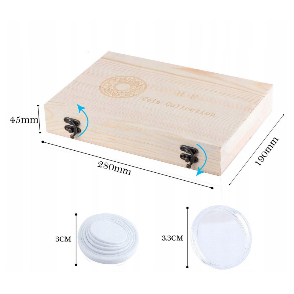 - 💰 - Коробка для колекції виготовлено з високоякісної соснової деревини з полірованою обробкою та має розміри приблизно 280x190x45 мм.