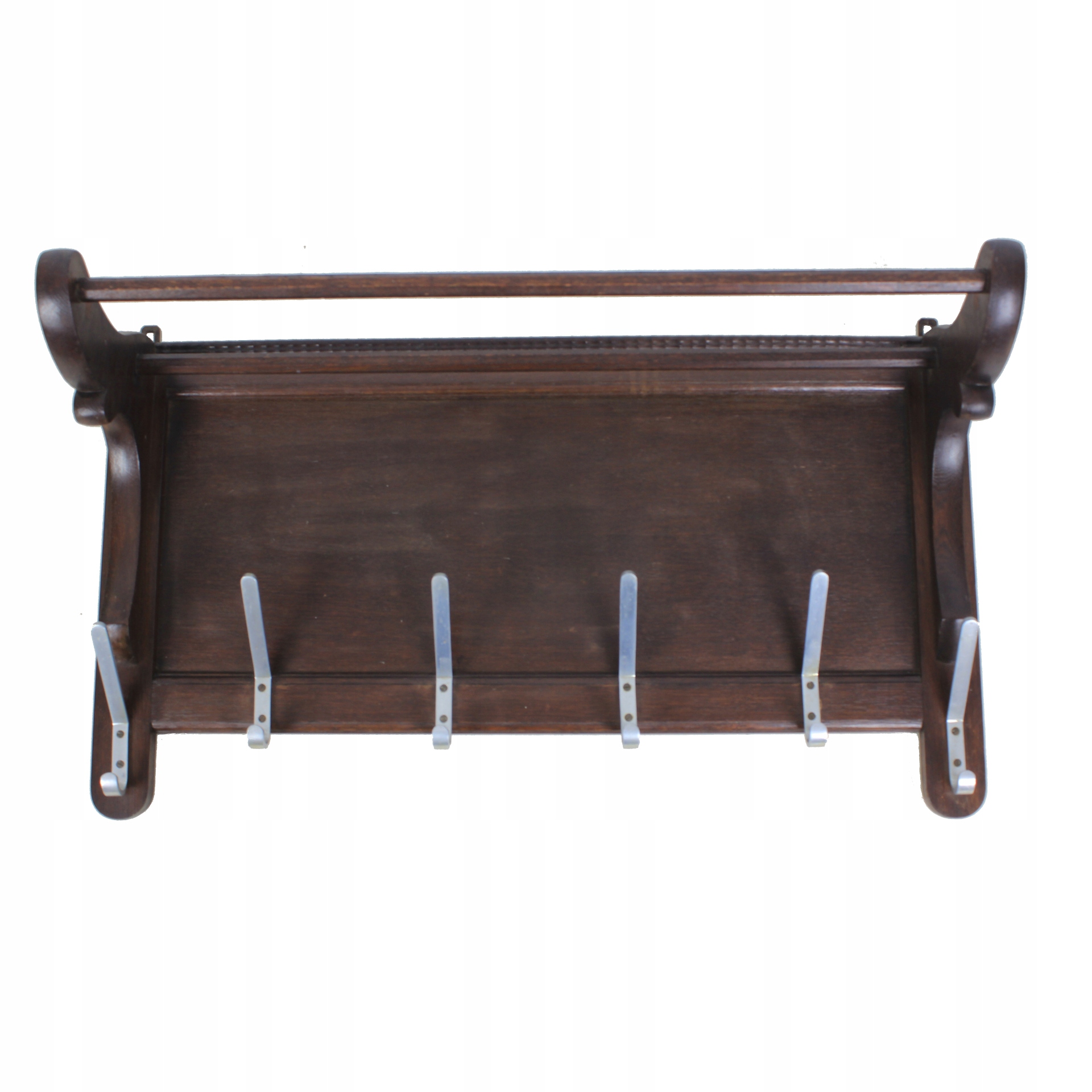 Дерев'яна настінна вішалка 1950-х років. Має шість алюмінієвих гачків і дві дерев’яні поперечини, які служать своєрідною поличкою для розміщення капелюха або кепки.