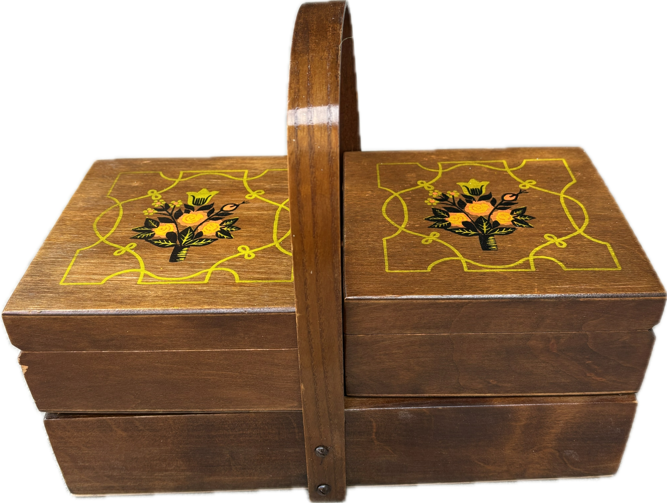 Нитка дерев'яної шкатулки рука -збокується з періоду PRL. Розміри; Висота 23 х 28 х 15 см. Сліди використання, стан елемента показаний на доданих фотографіях.