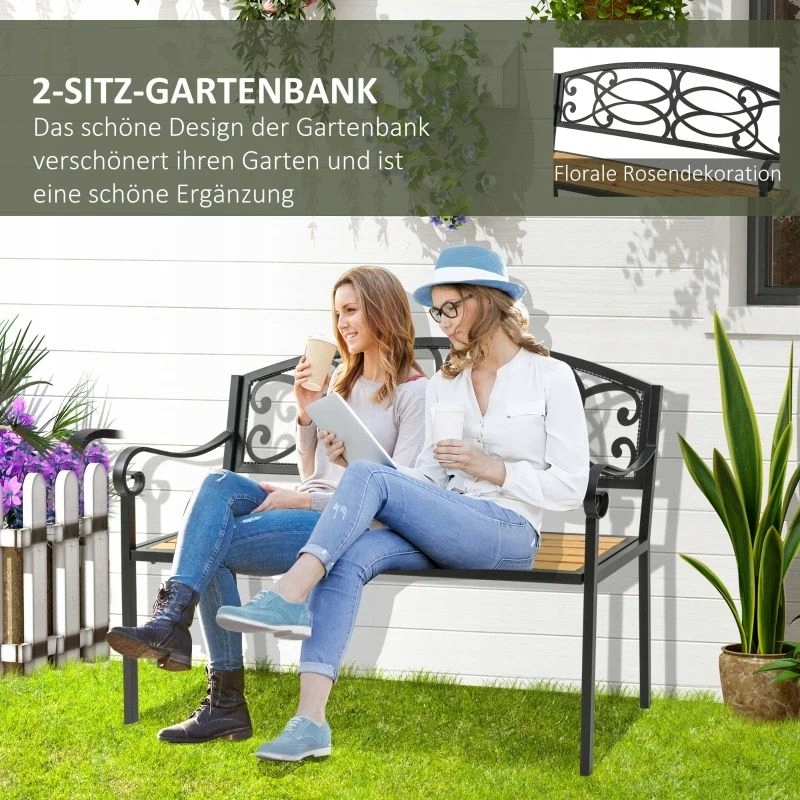 Садова лавка Outsunny 2-місна лавка з дерева металева паркова лавка до 220 кг Лавка для тераси Лавка для тераси зі спинками садові меблі з масиву чорного дерева + натуральний 127 x 52 x 88 см Використовуйте свій сад якнайкраще з нашою лавкою для тераси від Outsunny . Виготовлена з міцної сталі та натуральної ялини, ця паркова лавка є міцною та зручною для відпочинку на сонці. Квітковий візерунок надає лавці у патіо елегантний вигляд, який чудово доповнює будь-який зовнішній декор і зберігає її стильний вигляд. Додайте стилю своєму саду за допомогою цієї чудової садової лавки Outsunny!