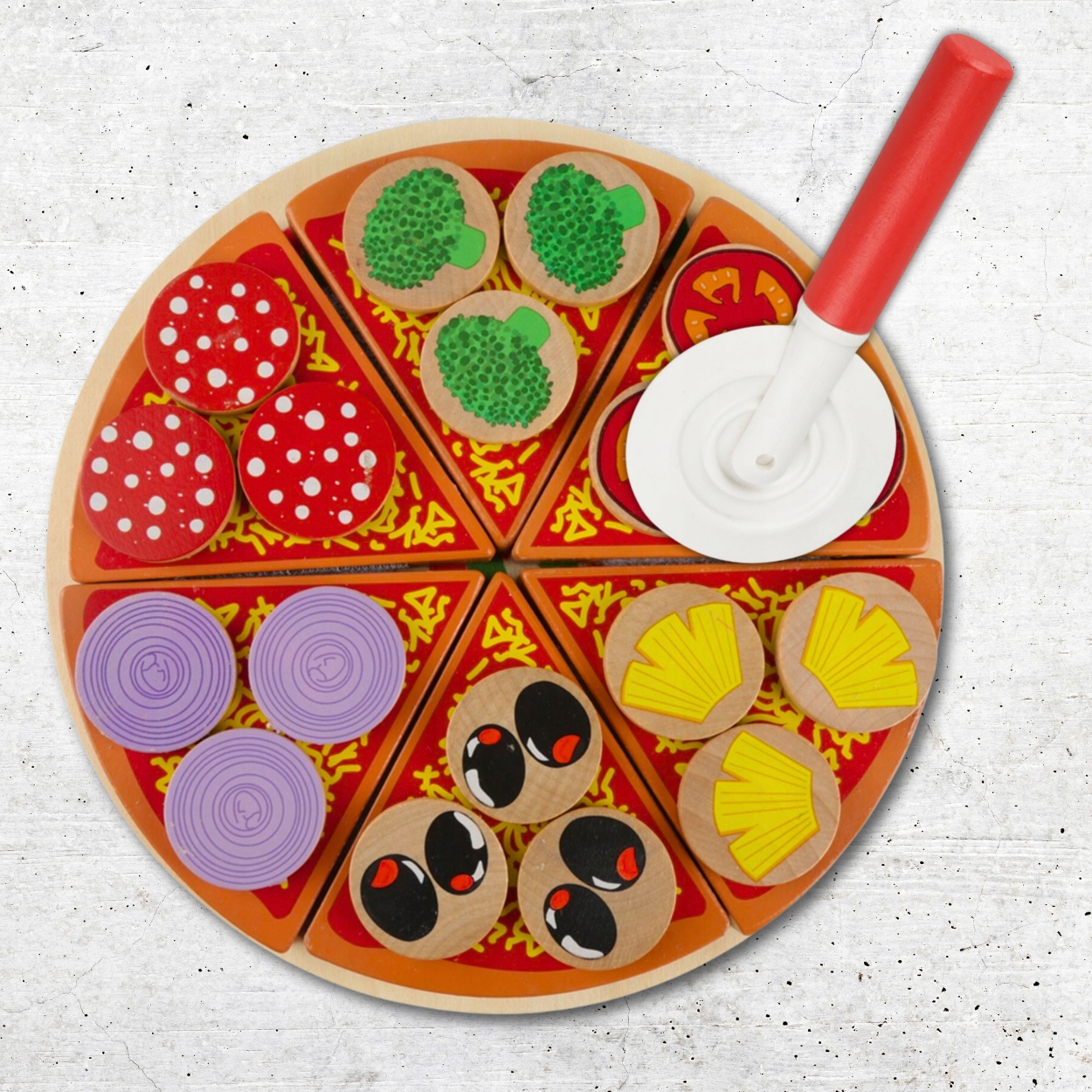 - В КОМПЛЕКТІ -в набір входить аж 27 елементів: підставка, 6 шматочків піци, лопатка, ніж для поділу тіста, а також 3 шматочки ананаса, цибулі, помідора, брокколі , оливки та салямі. Вся річ виготовлена з високоякісної деревини та пофарбована спеціальною нешкідливою фарбою. Крім того, він має стрічки-липучки, які дозволяють розрізати піцу та складати її після гри.