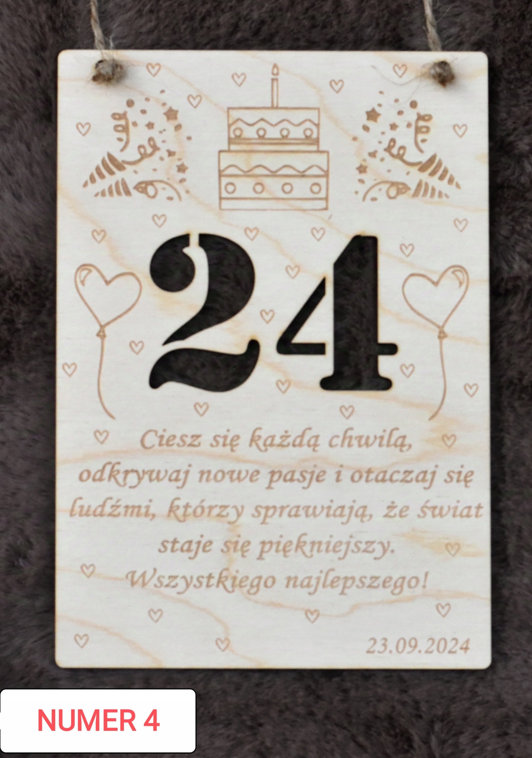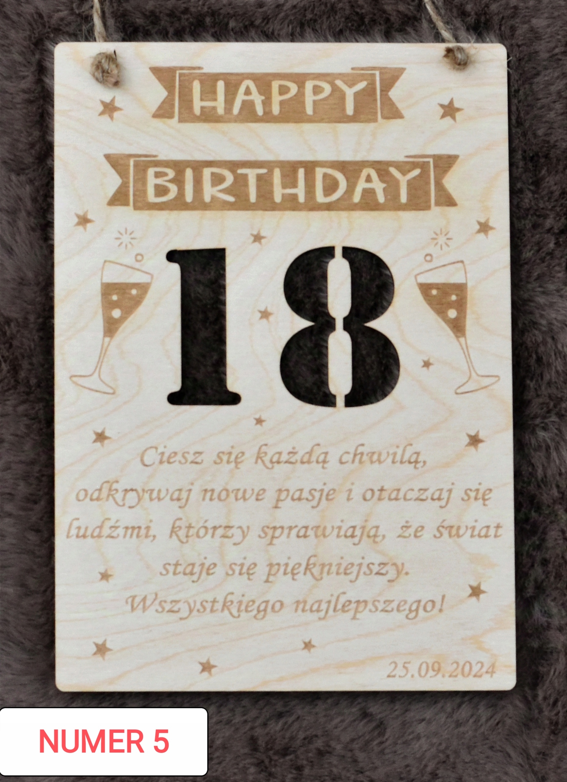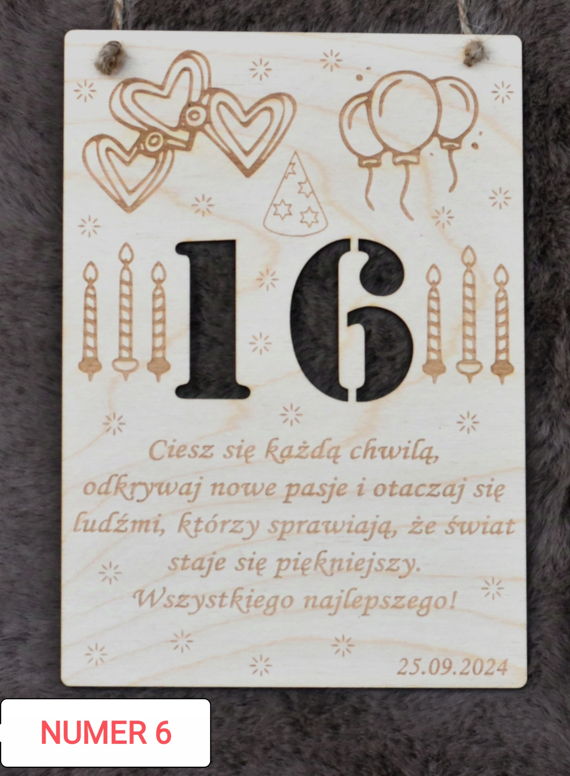 Оригінальний та незабутній подарунок імениннику. Дерев'яна листівка з вирізаним номером і вигравіруваними побажаннями, яку можна підвісити на джутову нитку. Можливість гравіювання будь-якого тексту або побажань (макс. 30 слів). На вибір 6 дизайнів листівок.