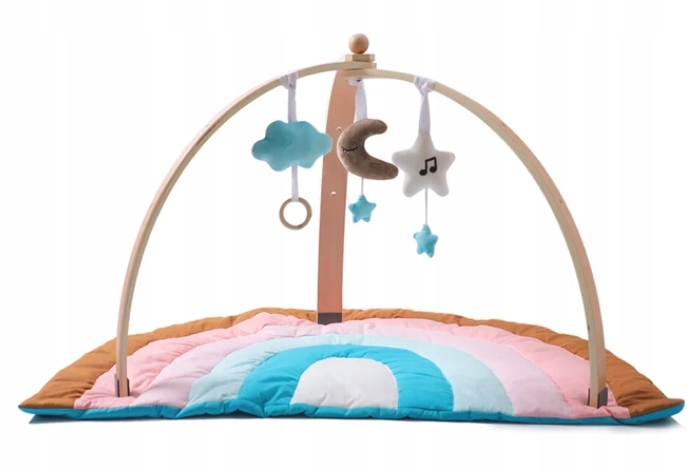 Пов’язка на голову складається з 3 плечей, з’єднаних угорі невеликим дерев’яним елементом, кулькою. Легко складати, розкладати та брати з собою, наприклад, подорожуючи з дитиною. Готові отвори на різній висоті забезпечують гнучкість використання різноманітних підвісних іграшок.