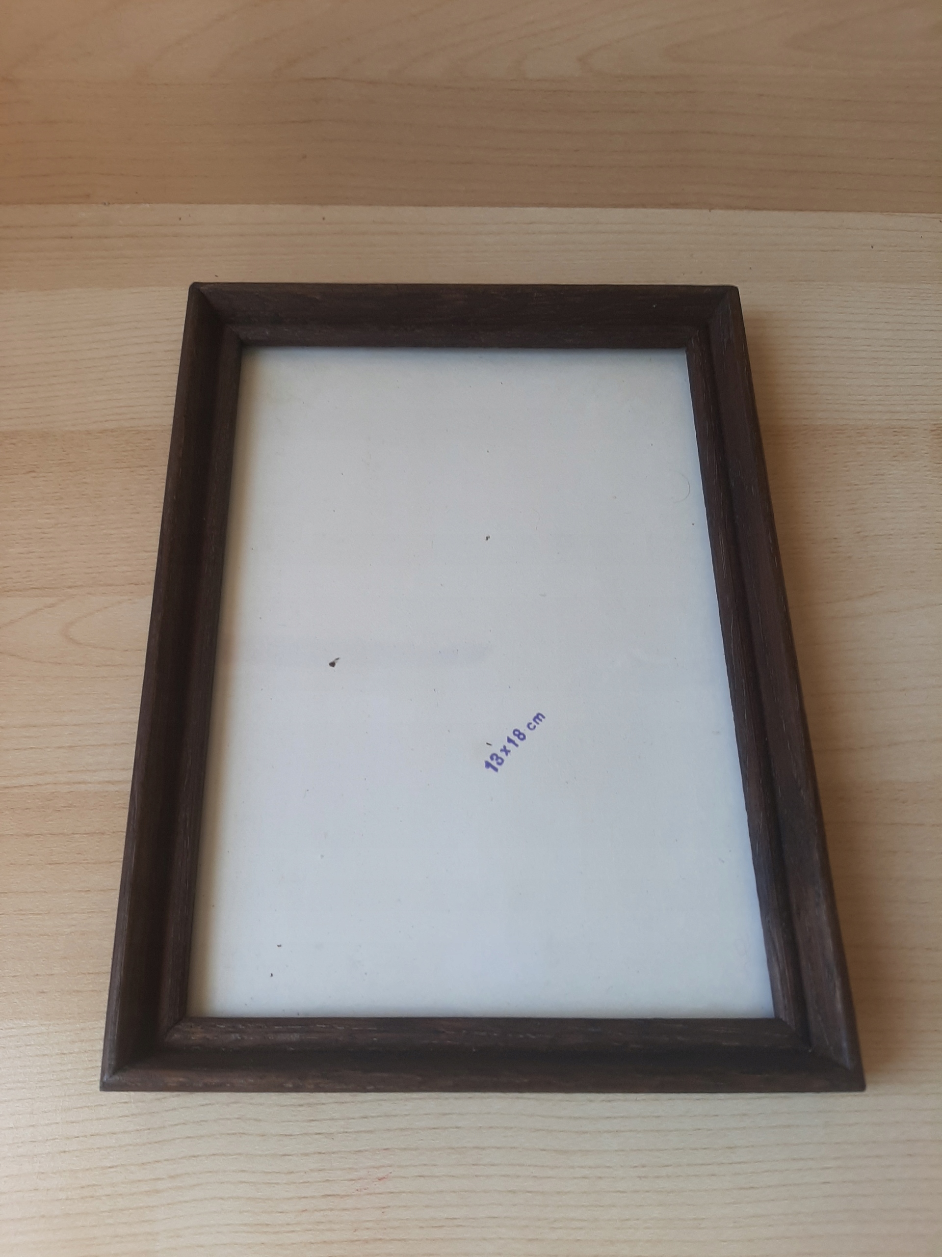 дерев’яна рама 13 см х 18 см зі склом, у комплекті з розширенням дроту та підтримкою. Цінник та виробник. Spółdzielnia rzemieślnicza glaziers та вітражі, Познань.