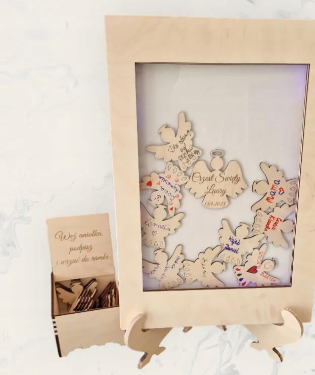 Нехай ця красива дерев'яна рамка для гостьової книги стане невід'ємною частиною ваших спогадів про хрещення. Це унікальний спосіб зберегти побажання та приємні слова від близьких, які стануть цінним сувеніром на все життя. Ми також пропонуємо персоналізацію ангела, тож ви можете додати ім’я та дату хрещення, щоб зробити цей сувенір ще більш особливим.