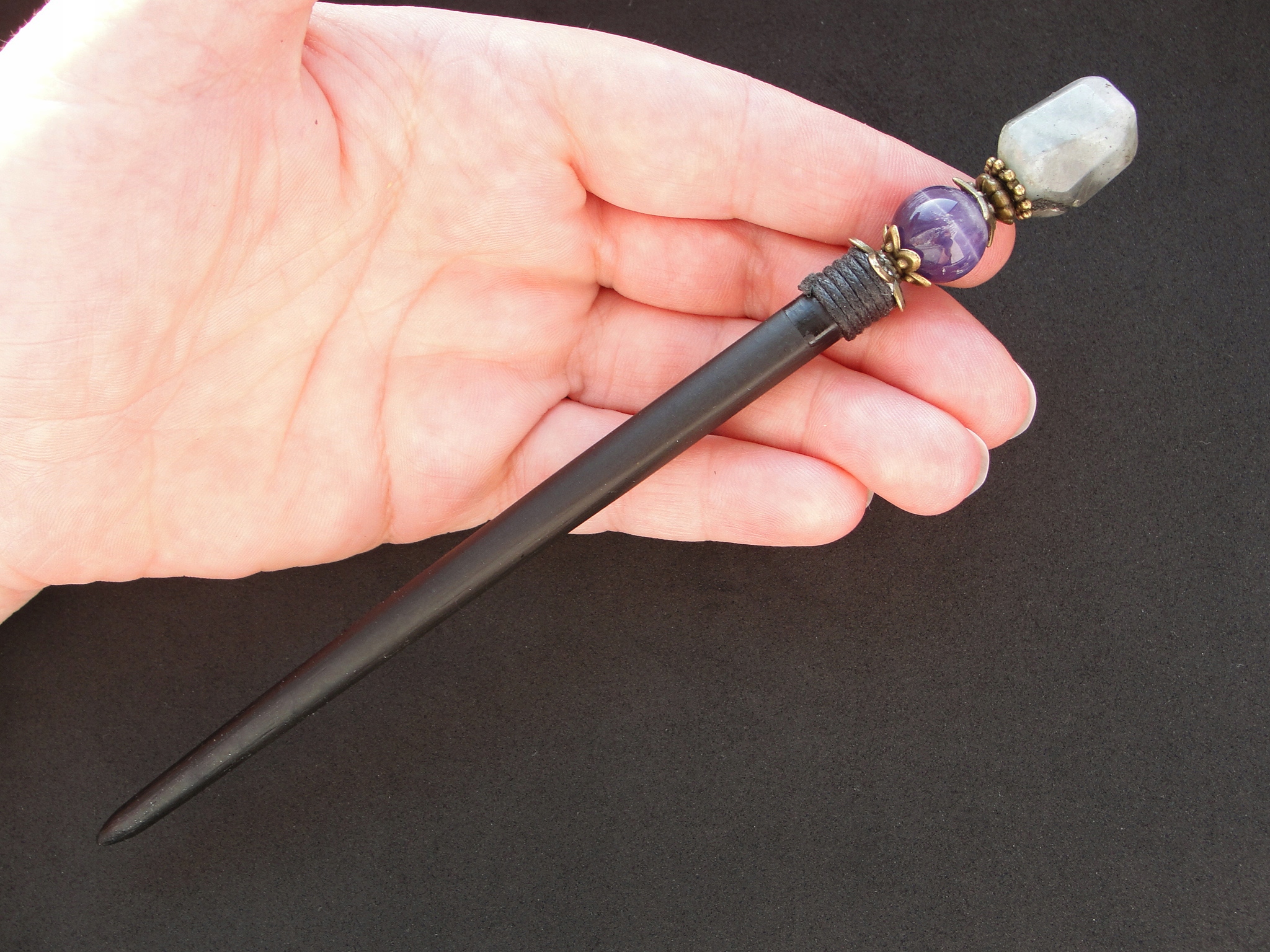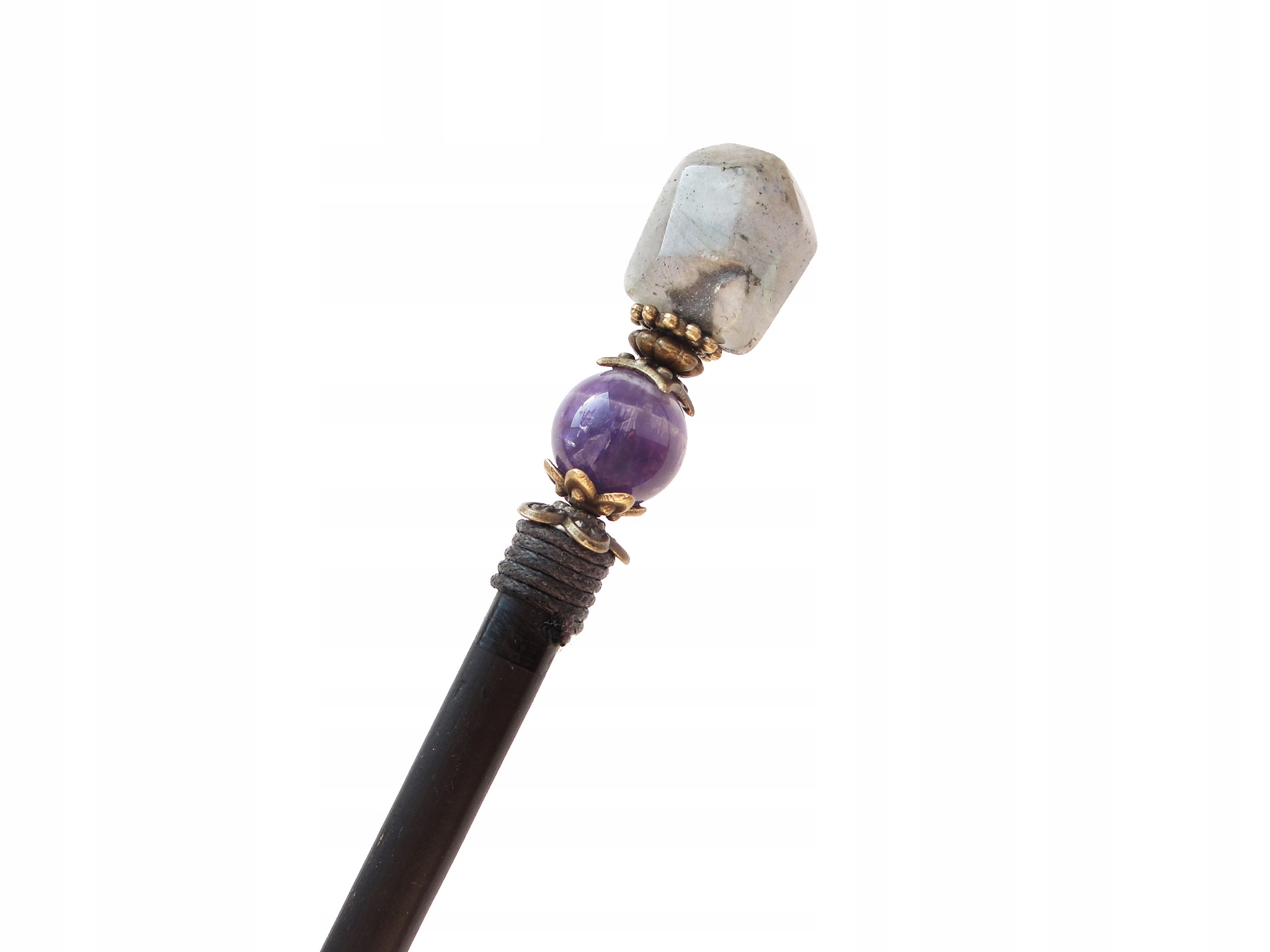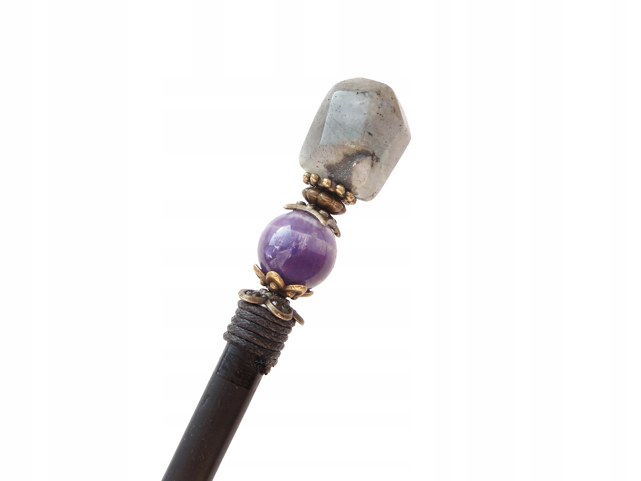Дерев'яна шпилька-голка з лабрадоритом і аметистом - сіро-фіолетова