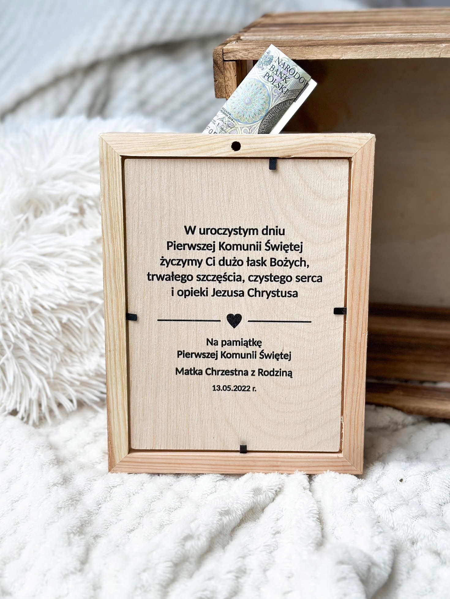 Дерев'яна скарбничка з ім'ям дитини - це не тільки практична річ, а й особистий і довговічний подарунок до Першого Святого Причастя.
