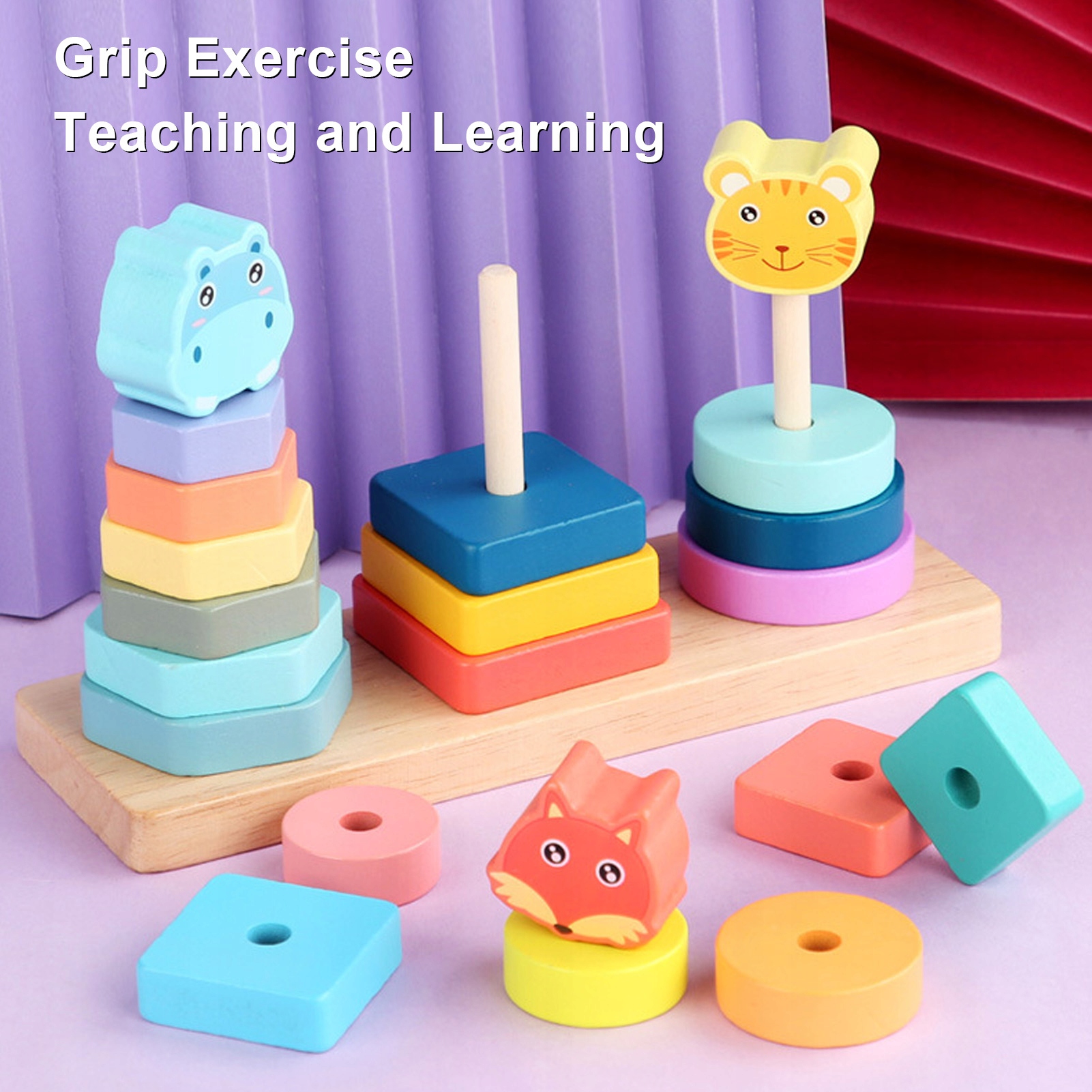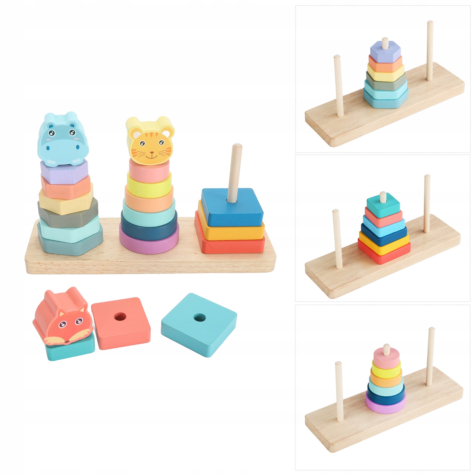 1. Покращує розпізнавання форм: набір дерев’яних блоків містить елементи у формі тварин, які допомагають дітям розпізнавати різні геометричні фігури, підтримуючи їхню спостережливість і просторову уяву.