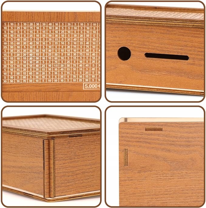- На дерев’яній скарбничці надруковані цифри, які ви можете легко позначити та записати прогрес своїх заощаджень. Скарбничка з цифрами вміщує до 5000 євро, знявши її, ви можете видалити наявні позначки та знову почати накопичувати.