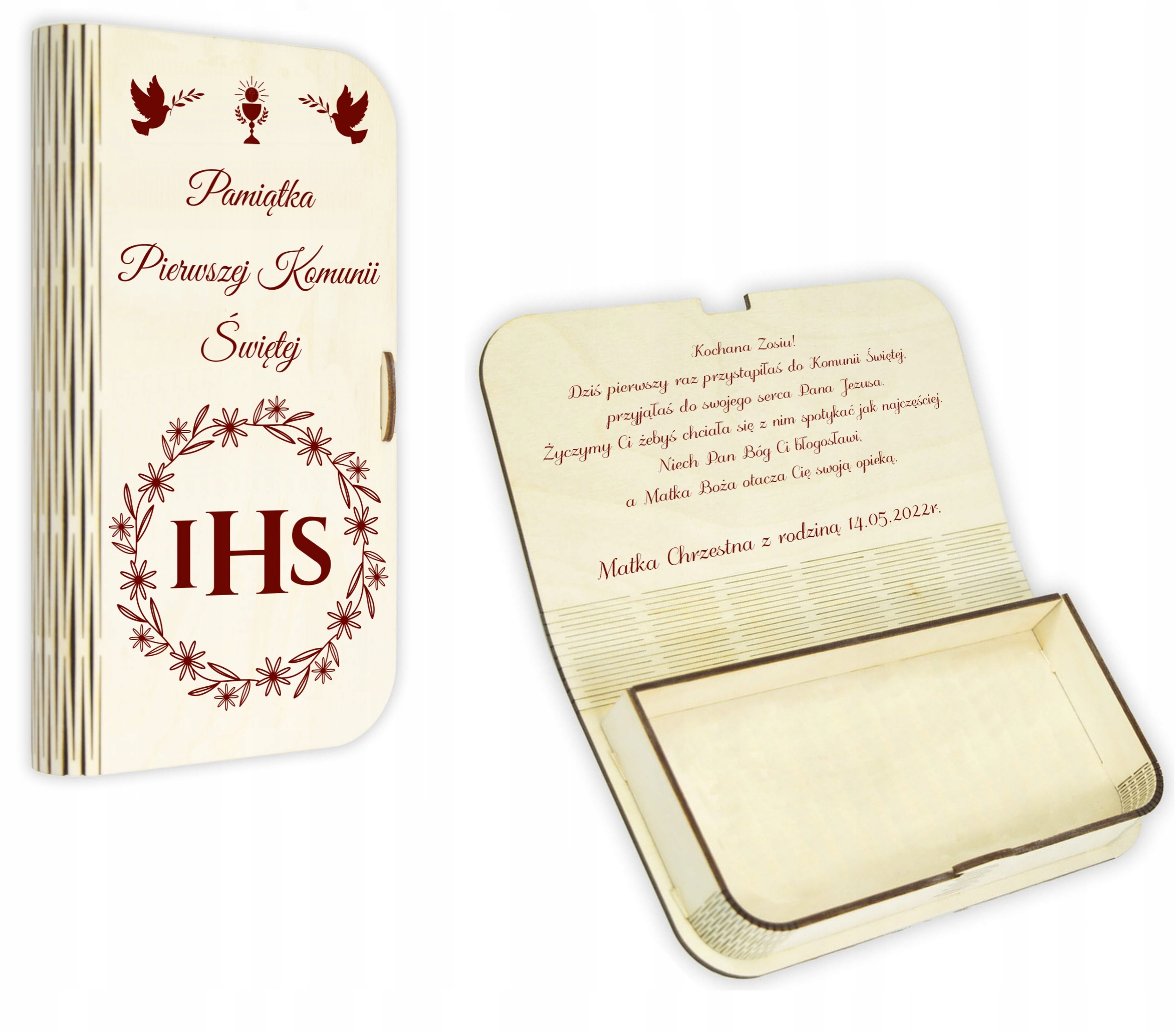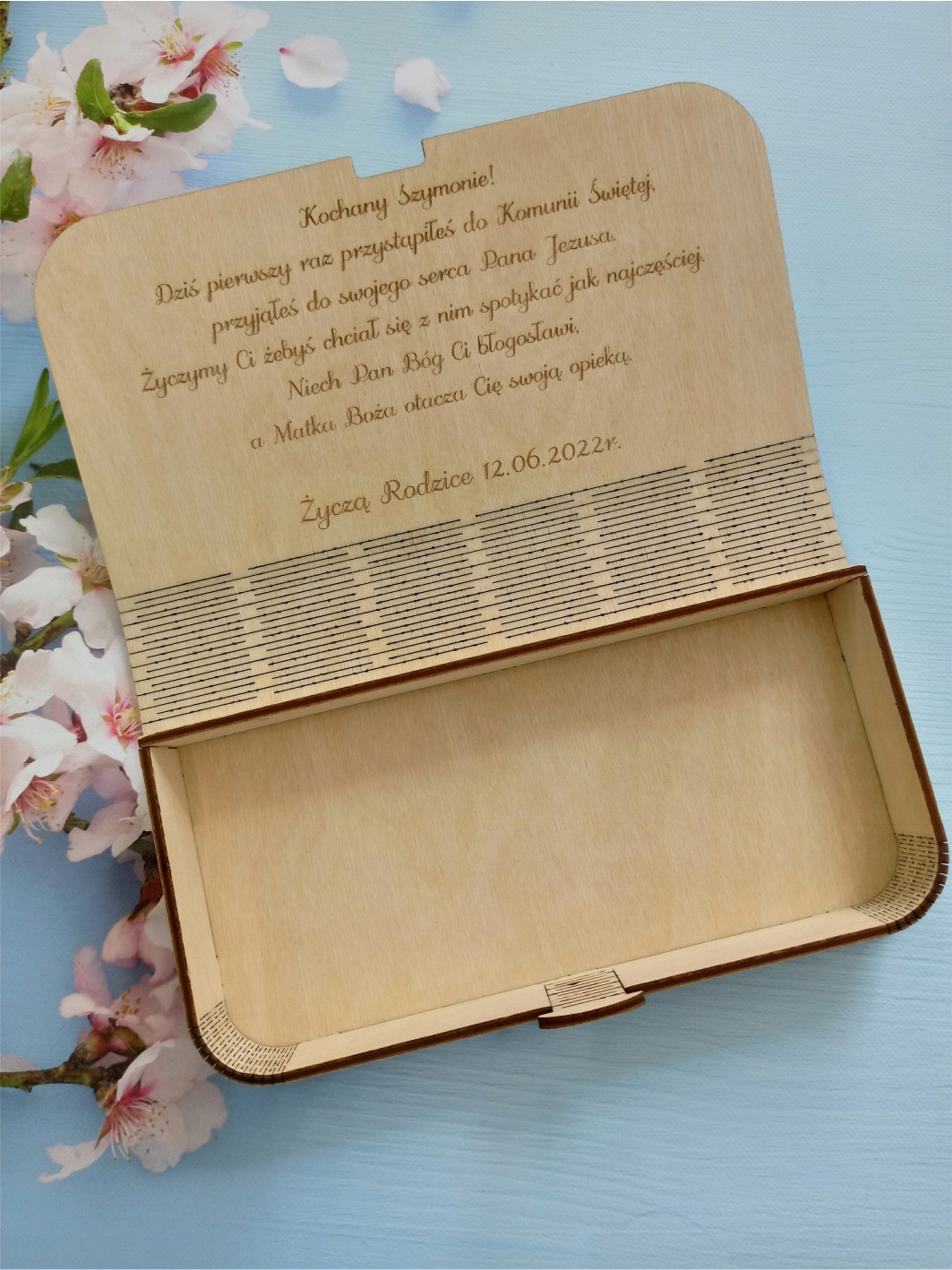 Індивідуальна коробка для грошей і шоколаду, створена спеціально як сувенір до Першого Святого Причастя. Наші коробки надзвичайно ретельно створені, щоб увічнити цей особливий момент у житті дитини. Можливість додати власний текст, ім’я та дату робить їх індивідуальними та унікальними подарунками.