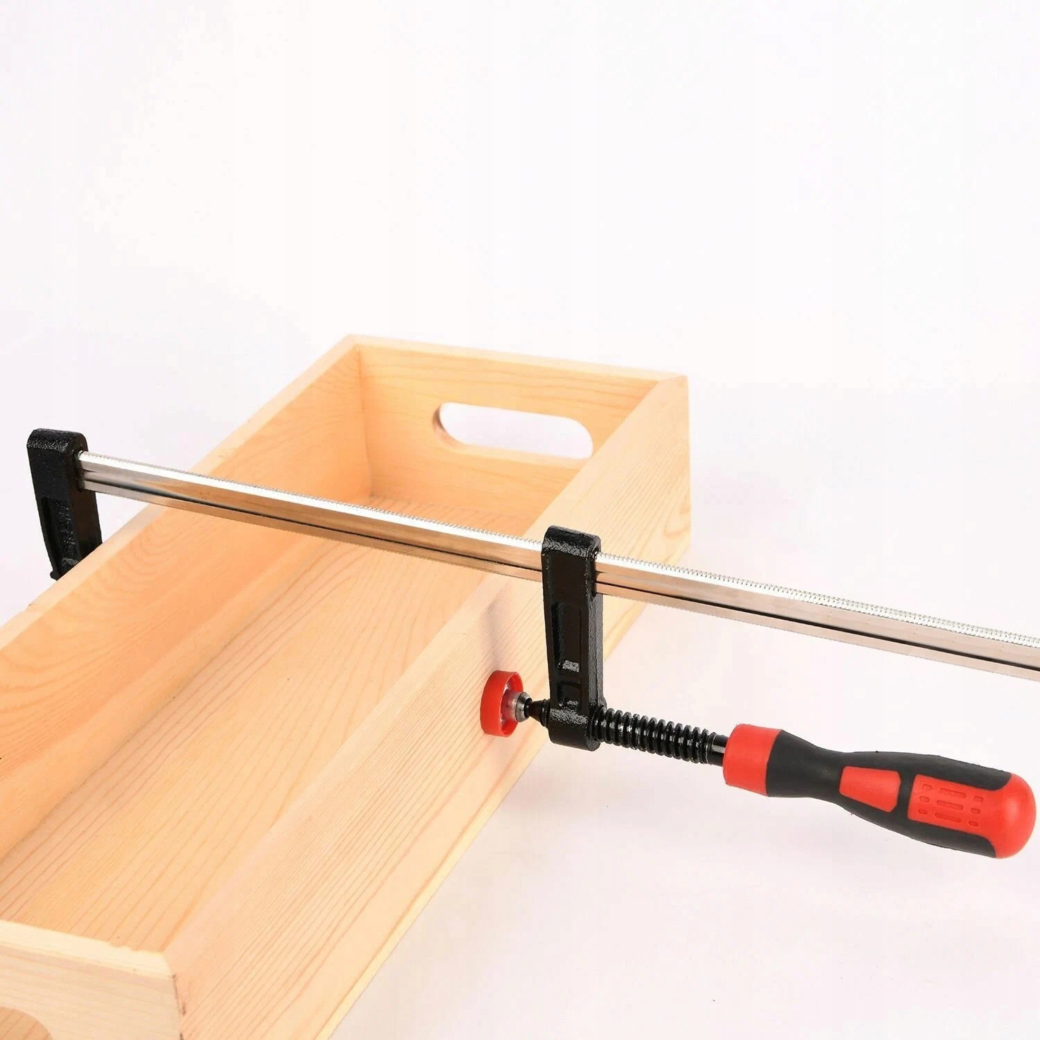 Стабільний, сильний затискач для столярної та складової роботи тип F. Пластина тиску, встановлена на кульковій валиці, легко адаптується до поверхні, а м'які пластикові покриви захищають стислий матеріал. Ручка, покрита м'яким технічним матеріалом, дозволяє сильно затягнути матеріал.