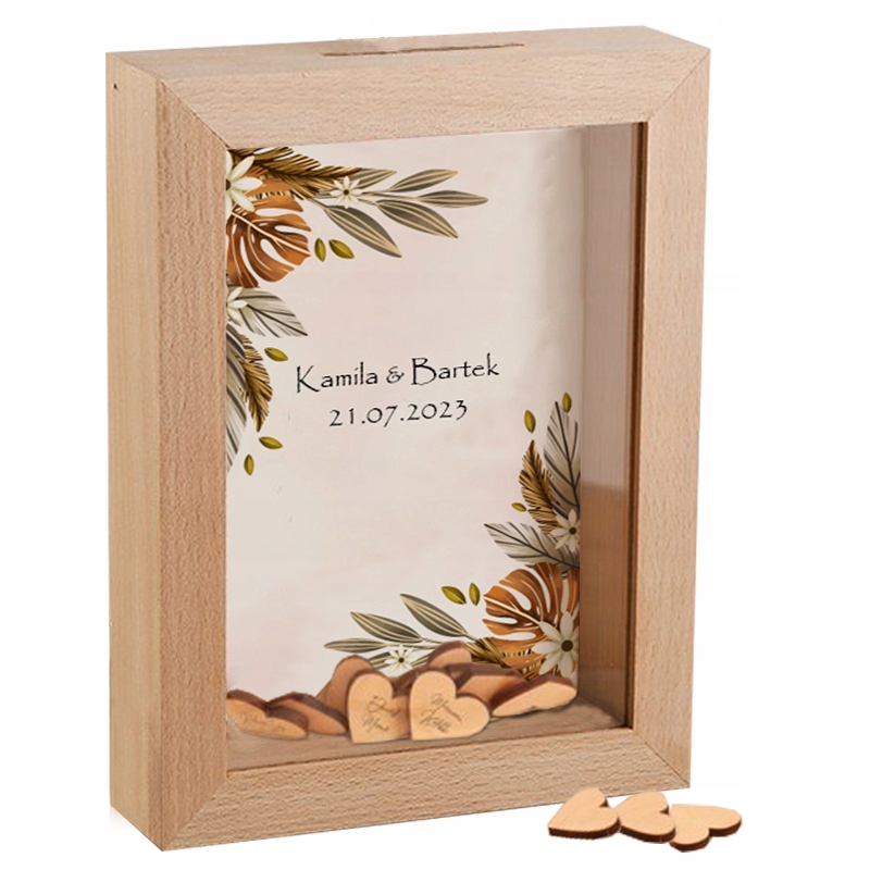 Оригінальна ідея для весільної гостьової книги - 3D скарбничка з декоративною наклейкою в наборі з дерев'яними сердечками. Якщо ви шукаєте унікальну книгу, ви щойно її знайшли — красиву рамку з місцем для дерев’яних сердечок, які гості можуть підписати своїми іменами.