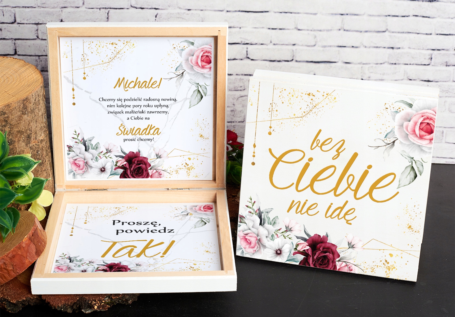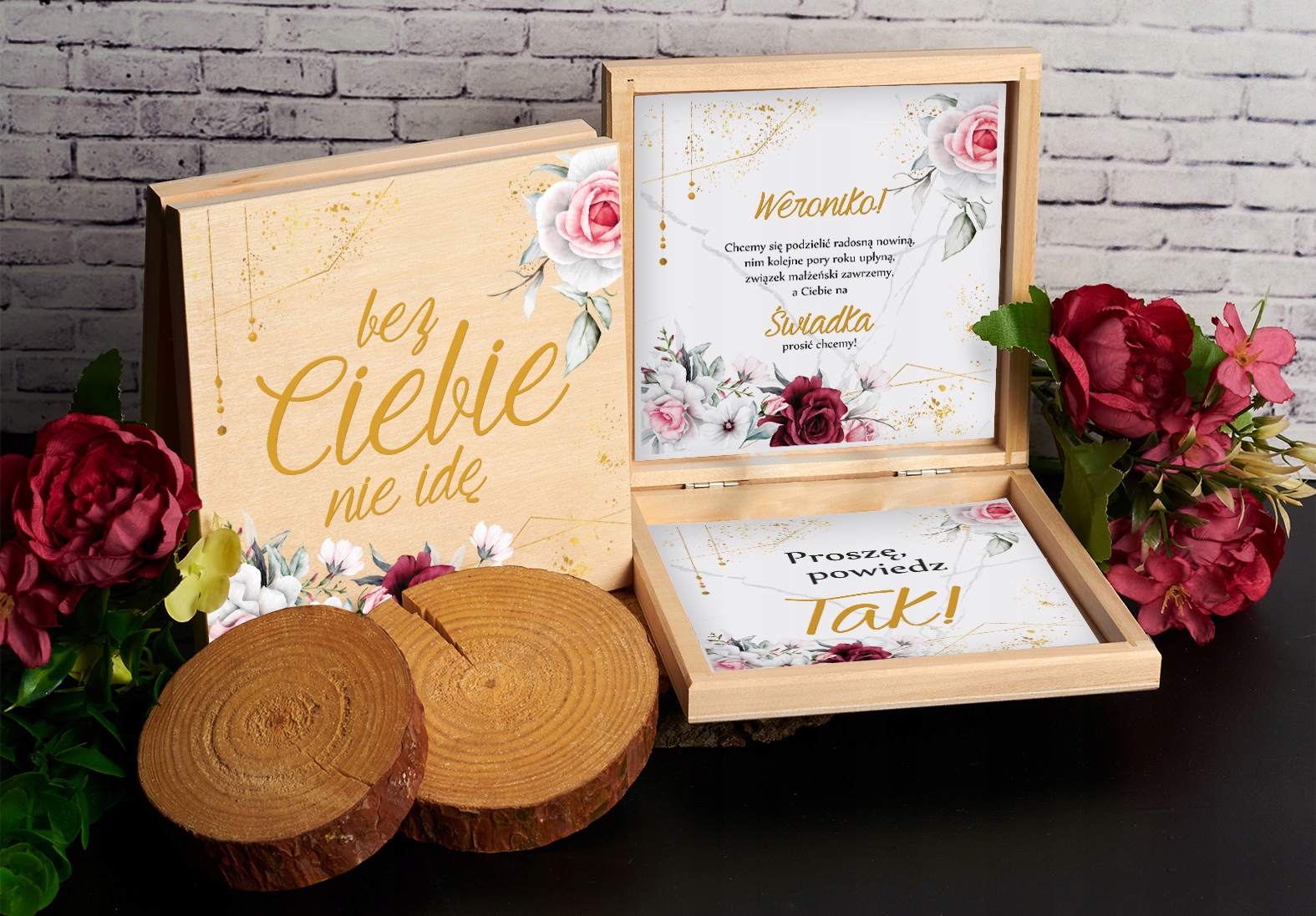 b>ідеальна фрейліна чи свідок. В такому випадку варто підготувати майбутнім свідкам сюрприз і оригінально здивувати їх запитанням! Наша дерев'яна шкатулка з гравіюванням - найкращий подарунок із проханням про свідок. Це елегантний, стильний і водночас надзвичайно креативний та вигадливий подарунок. Запевняємо, що для одержувача це буде приємним сюрпризом і він без вагань відповість на ваше запитання ствердно. Тим більше, що наша ідея подарунка з проханням про свідок може бути персоналізована, що підтвердить унікальність подарунка. Дерев'яна коробка - розміри: 14,5 х 14,5 см. Колір ящика - натуральний або білий. Всередині запрошення на щільному папері.
