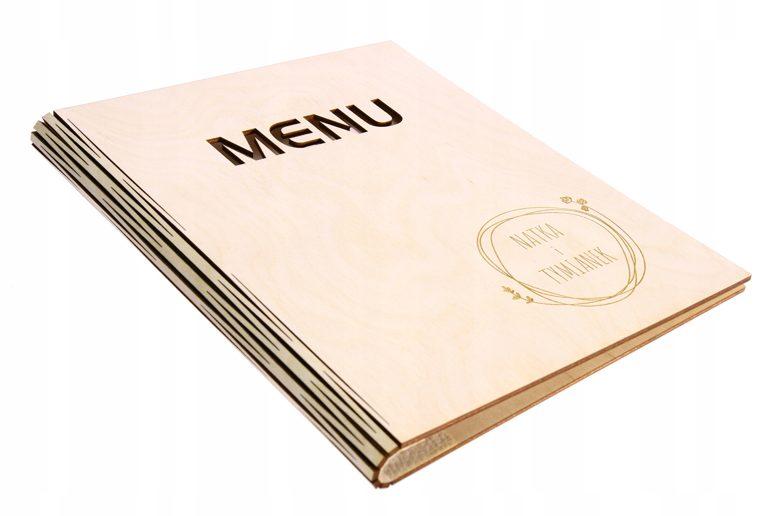 Кришка меню виготовлена з фанери товщиною 3 мм. Обкладинки поліровані, без нагару від різання та лазерного гравіювання.