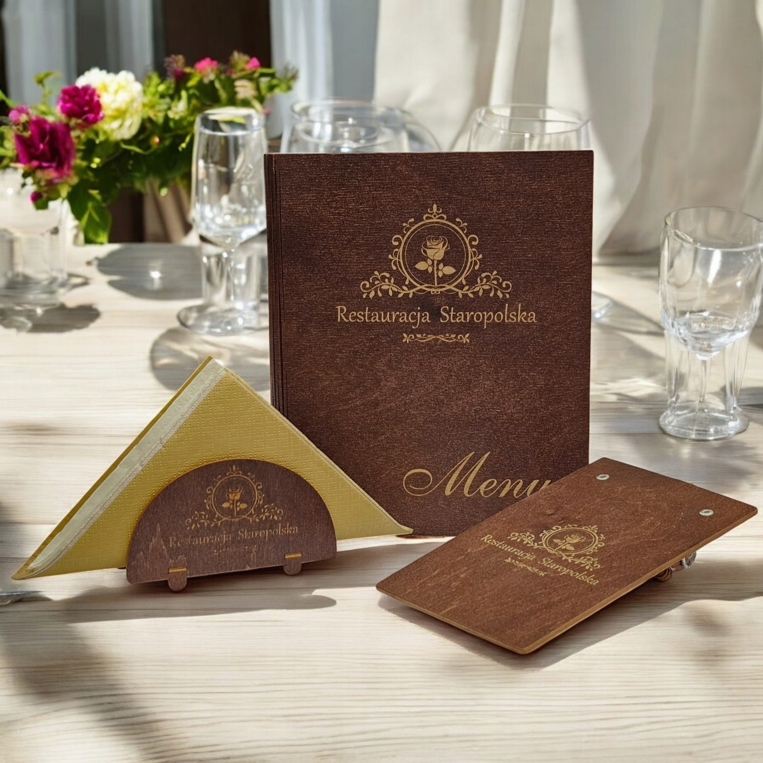 Додайте трохи елегантності та унікального персонажа до свого ресторану, піцерії чи бару завдяки нашому меню з дерев’яними кришками та гравюром логотипу. Це унікальне дерев’яне коричневе меню з логотипом не тільки приверне увагу, але й підкреслює професіоналізм ваших приміщень! Коричневе меню з логотипом Це ідеально підходить для будь -якого ресторану, піцерії чи бару. Завдяки вже розміщеній t -сорочці всередині картки з графіком страв, ви можете швидко доповнити або замінити новими. Розмір карт становить 14,8 см х 21 см (A5). Набір включає 10 шт. Якщо потрібна менша сума, будь ласка, інформація. Ми негайно підготуємо меню з кількістю сорочок, які в кінцевому підсумку потрібні. Додавання або віднімання T -сорочок дуже просте, і ви можете зробити це самостійно під час використання. Завдяки варенізації обкладинки вони отримують свій унікальний темно -коричневий колір, але залишаючи видимі банки з натуральної деревини. Завдяки живопису їх також простіше очистити, ніж сиру деревину :)