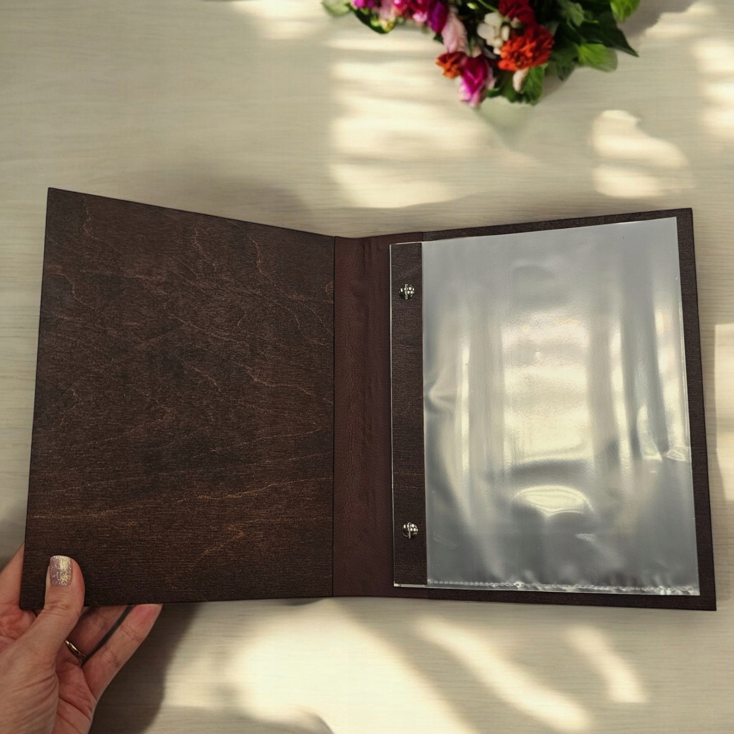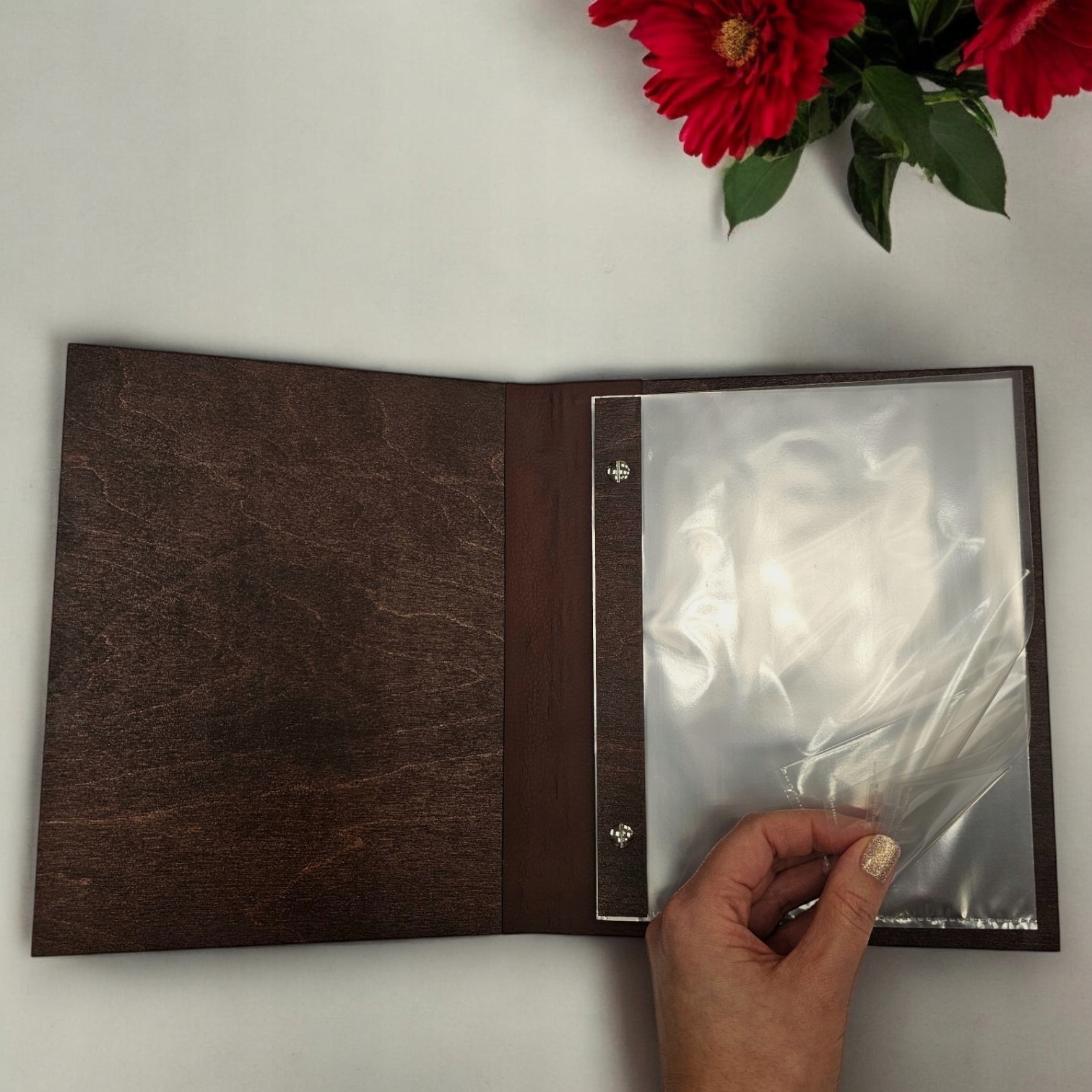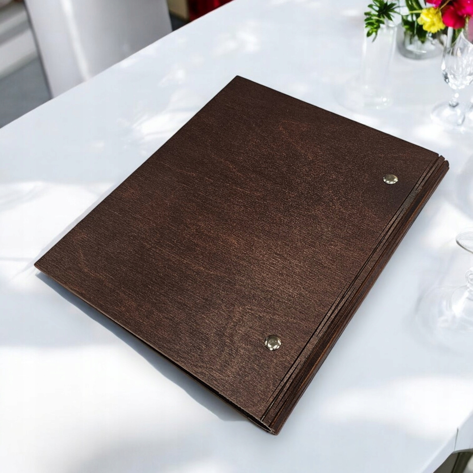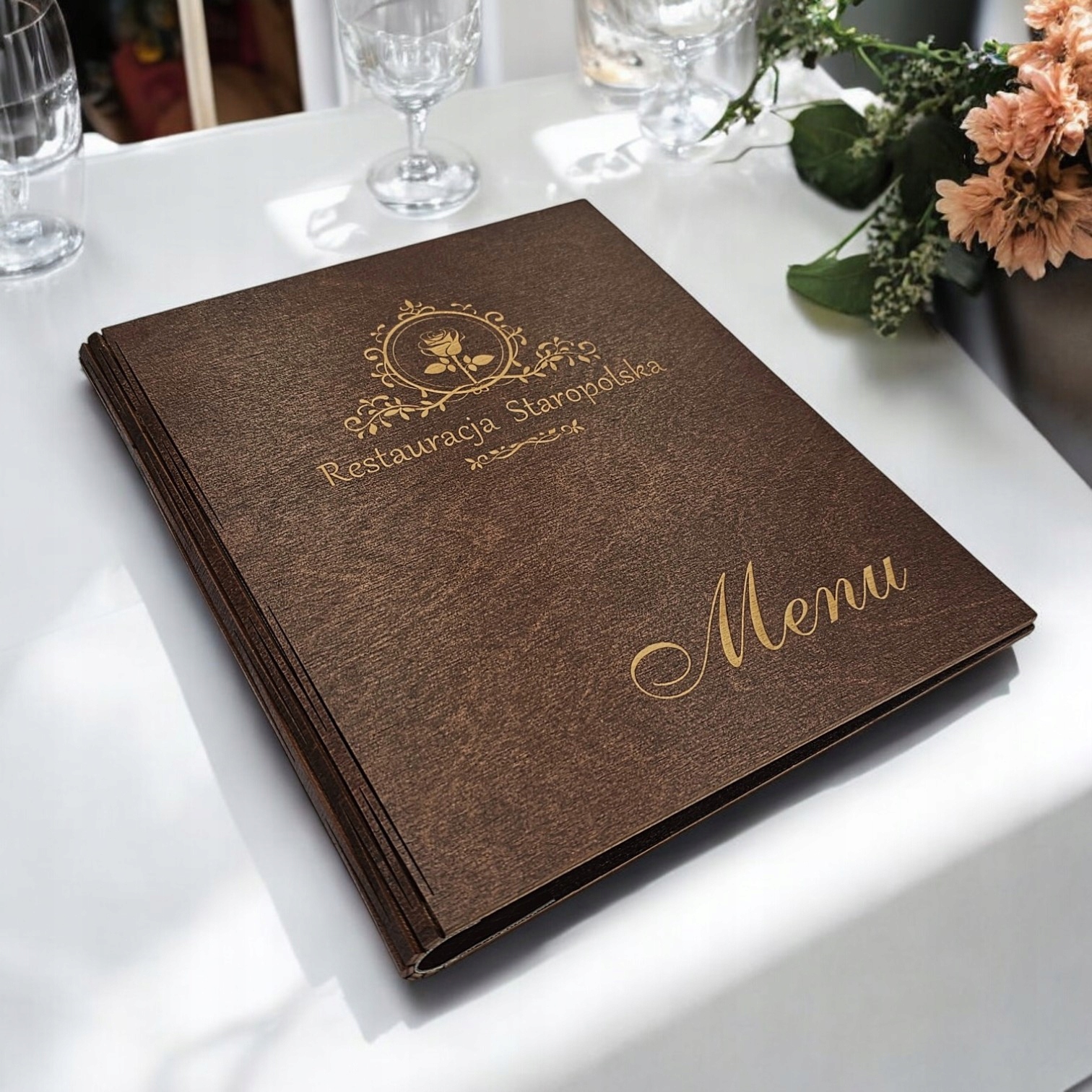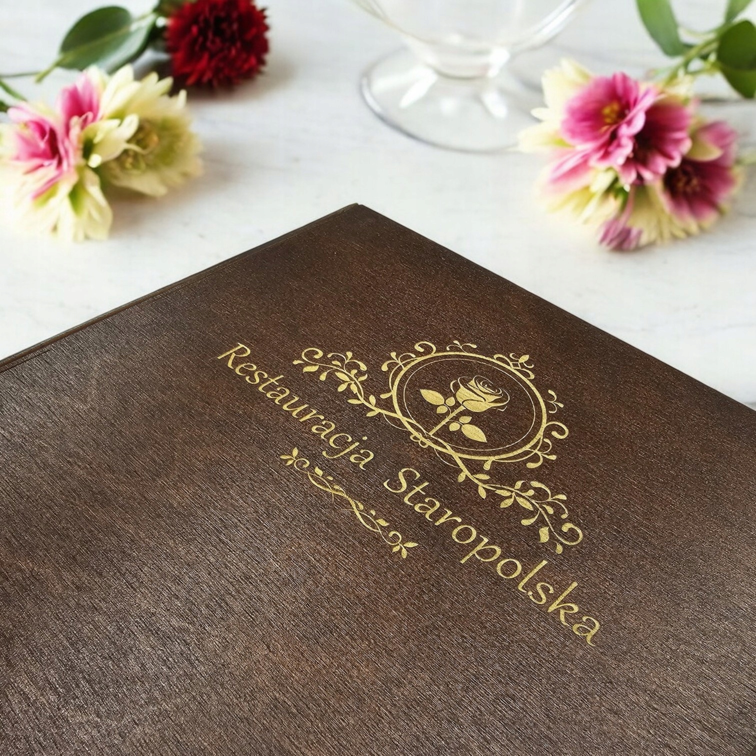 Меню з дерев'яної коричневої обкладинки з гравюром логотипу