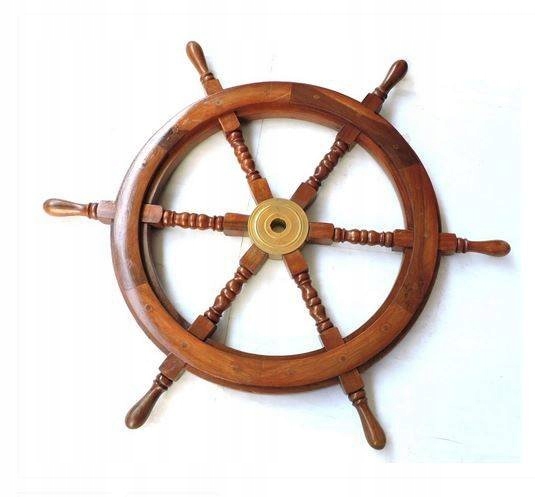 Декоративний дерев'яний штурвал діаметром 30". Репліка старовинного морського інструменту. Внутрішня частина виготовлена з латуні та має стандартизовані внутрішні розміри, тому може служити як стильна прикраса інтер'єру в морській атмосфері, а також як справжній штурвал на яхті.
