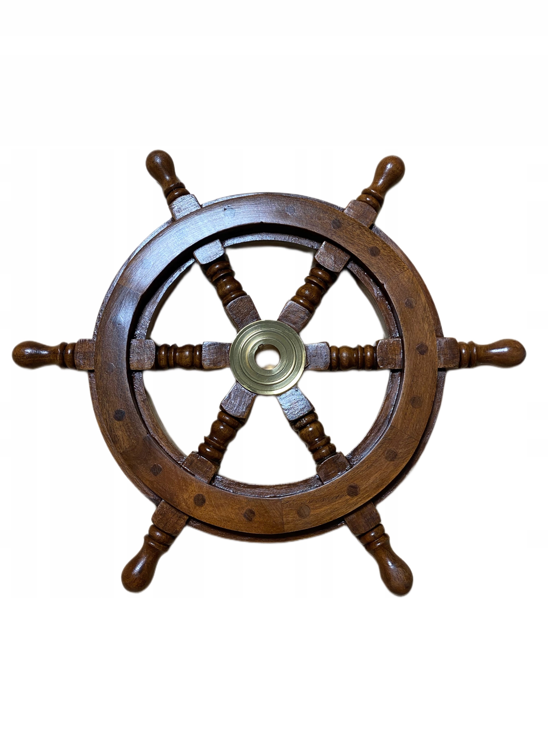 Класичне кермо на стіну. Виготовлена з деревини коричневого кольору, з легким блиском, покрита лаком. Важкий, витончений, добротно зроблений — ніби знятий прямо з палуби вітрильного корабля. Красива прикраса для стіни кабінету або вітальні.