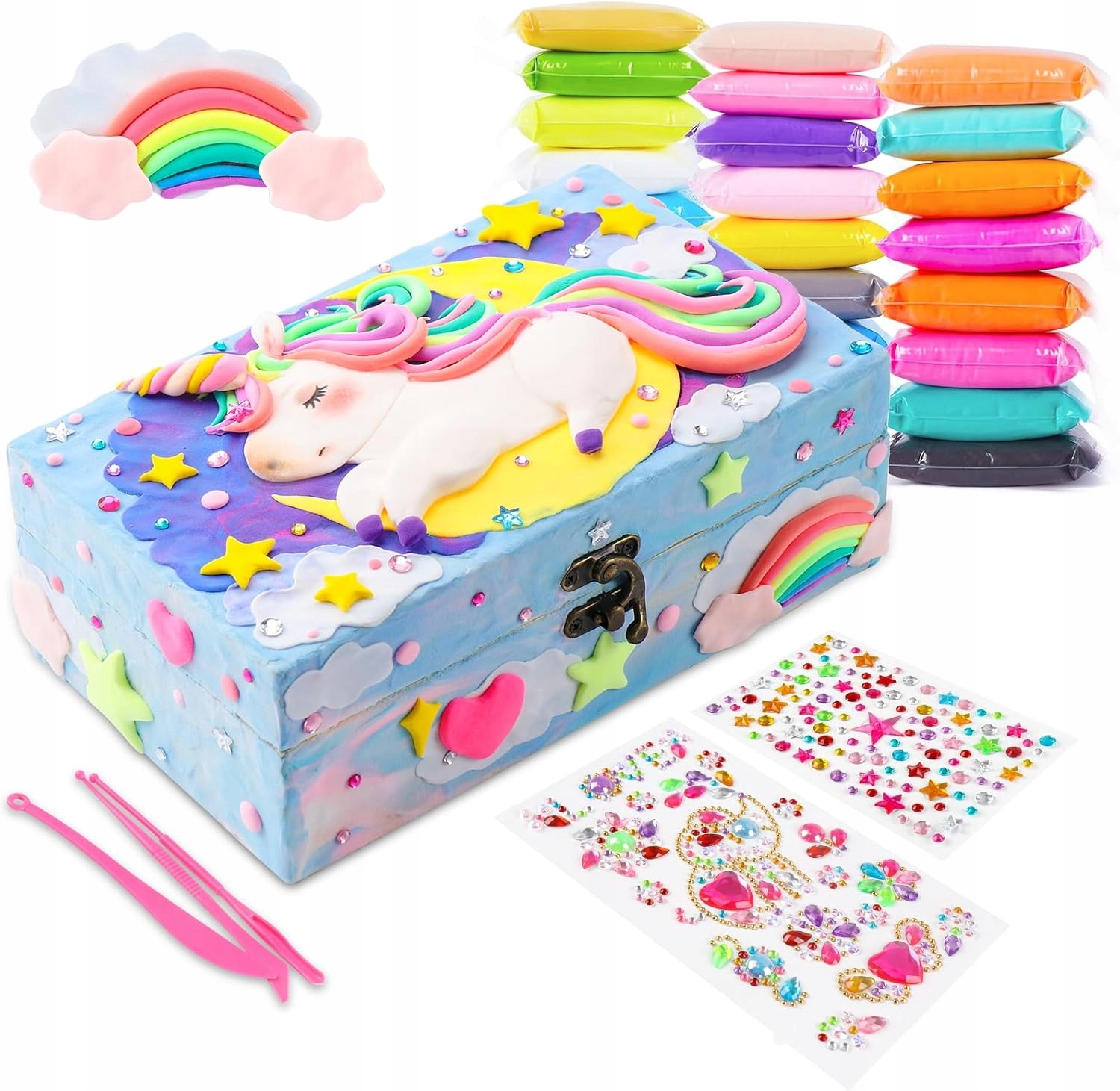 DIY набір для дітей дозволяє отримати повну персоналізацію коробки ювелірних виробів. Діти можуть замісити глину в будь -які візерунки, приклеїти їх до коробки, створюючи унікальний і красивий витвір мистецтва. Всі матеріали зберігаються у закритих, прозорих мішках для підтримки вологості та свіжості. Продукт не містить пшениці, глютену або казеїну.