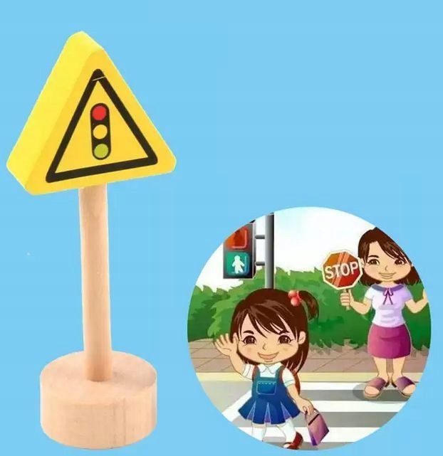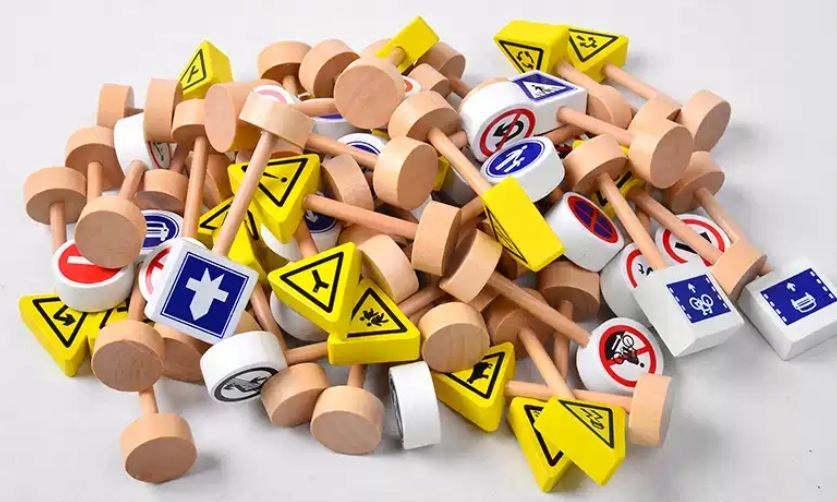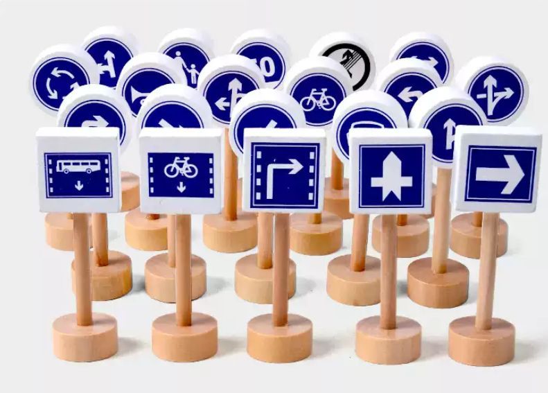 Набір дерев'яних дорожніх знаків. Це допоможе вам вивчити правила дорожнього руху і зробить гру з іграшковими машинками більш привабливою. У набір входить 50 двосторонніх табличок на підставках.