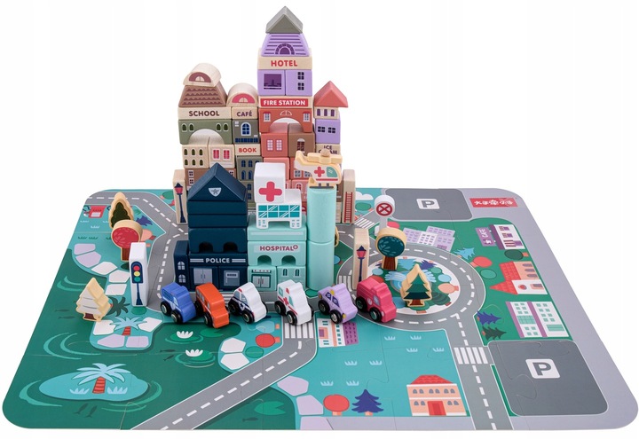 ДЕРЕВ'ЯНІ БЛОКИ МІСЬКІ МАШИНИ ПОЛІЦІЙНИЙ БАНК 136 ЕЛЕМЕНТІВ + ПАЗЛ Килимок