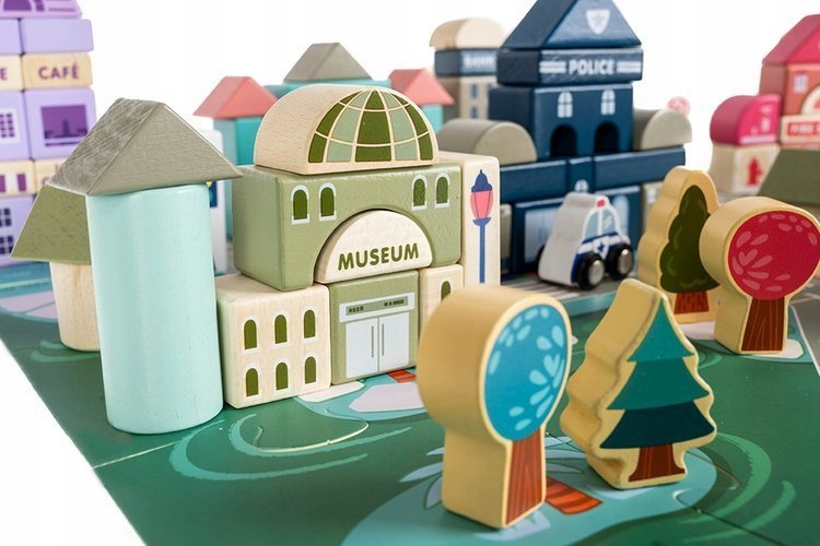 Освітні блоки місто дуже барвисті, завдяки якому вони сильно впливають на уяву дітей. Таким чином, іграшка підтримує розвиток творчості дитини, а логічне мислення покращується. Дерев’яне місто є міцним - тому немає страху, як у випадку з пластиковими іграшками, що пошкоджений елемент набору зашкодило. Вертоліт, шкільний автобус, машина)
