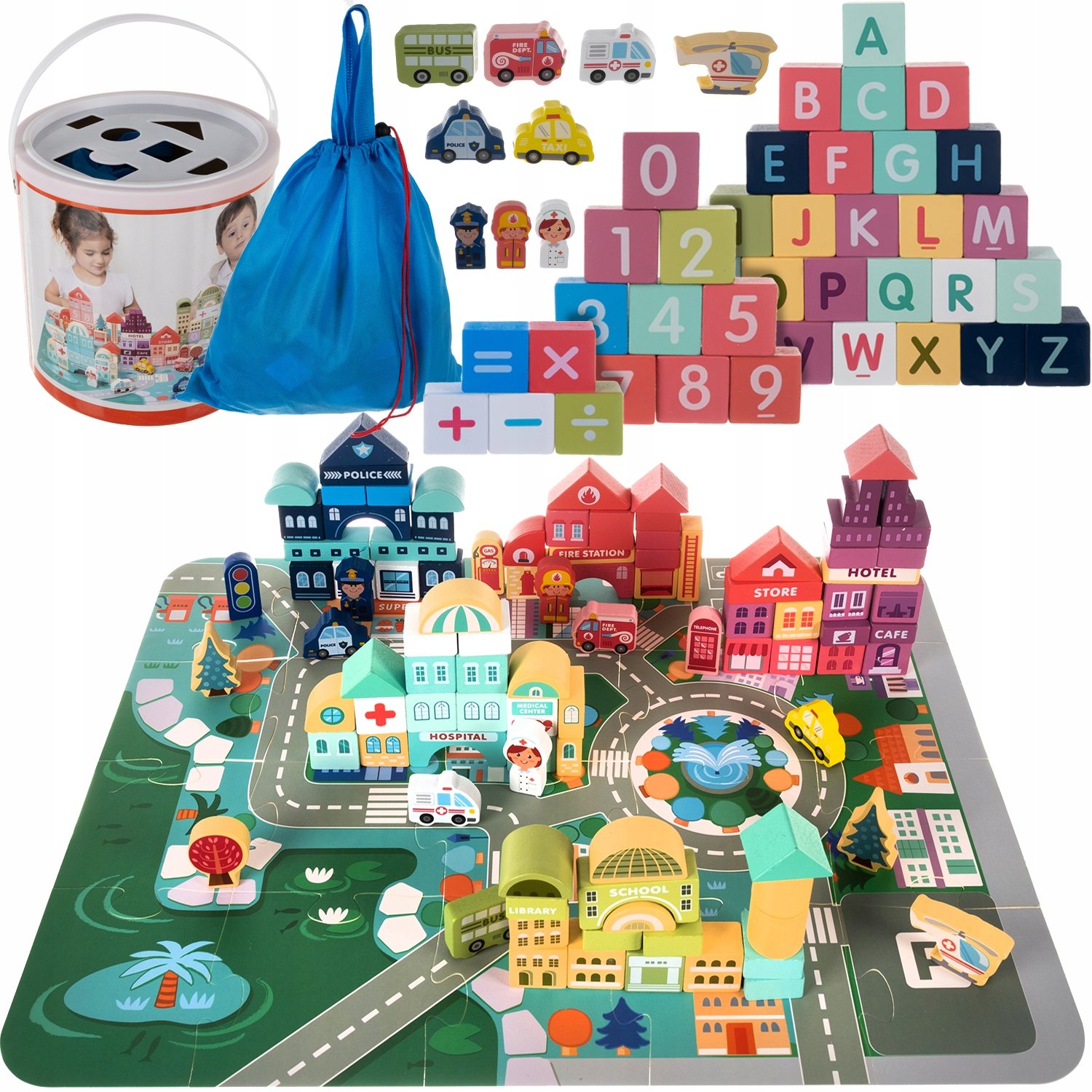 Іграшка з дерев'яних міських кубиків - це багато годин дивовижної розваги для найменших. Набір дуже великий – до нього входить до 100 різних типів блоків і 20 елементів пазлів, що імітують вулицю.