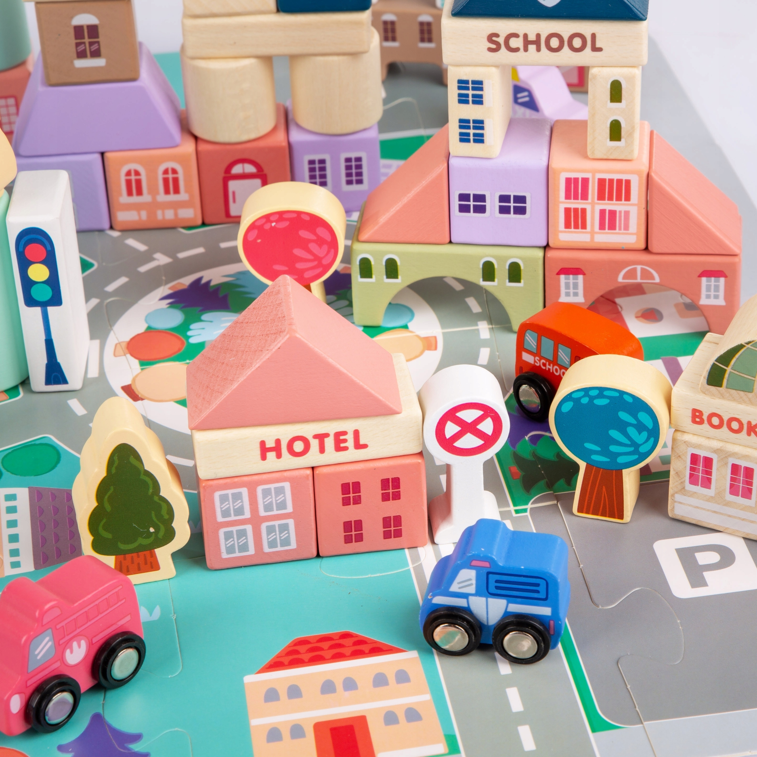 Включає все необхідне для створення функціонального міста. Дитина може побудувати поліцейський відділ, магазин, лікарню, музей, банк, книгарні, школу, пожежну частину, затишне кафе та готель. Вулиці, які будуть побудовані на спеціальному килимку, зможуть перемістити прикріплені транспортні засоби: швидка допомога, поліцейська машина, пожежна машина, шкільний автобус та компанія охоронця, а також вертоліт пливе над містом. Додаткові блоки в різних формах та кольорах та елементах з літерами та цифрами диверсифікують задоволення.