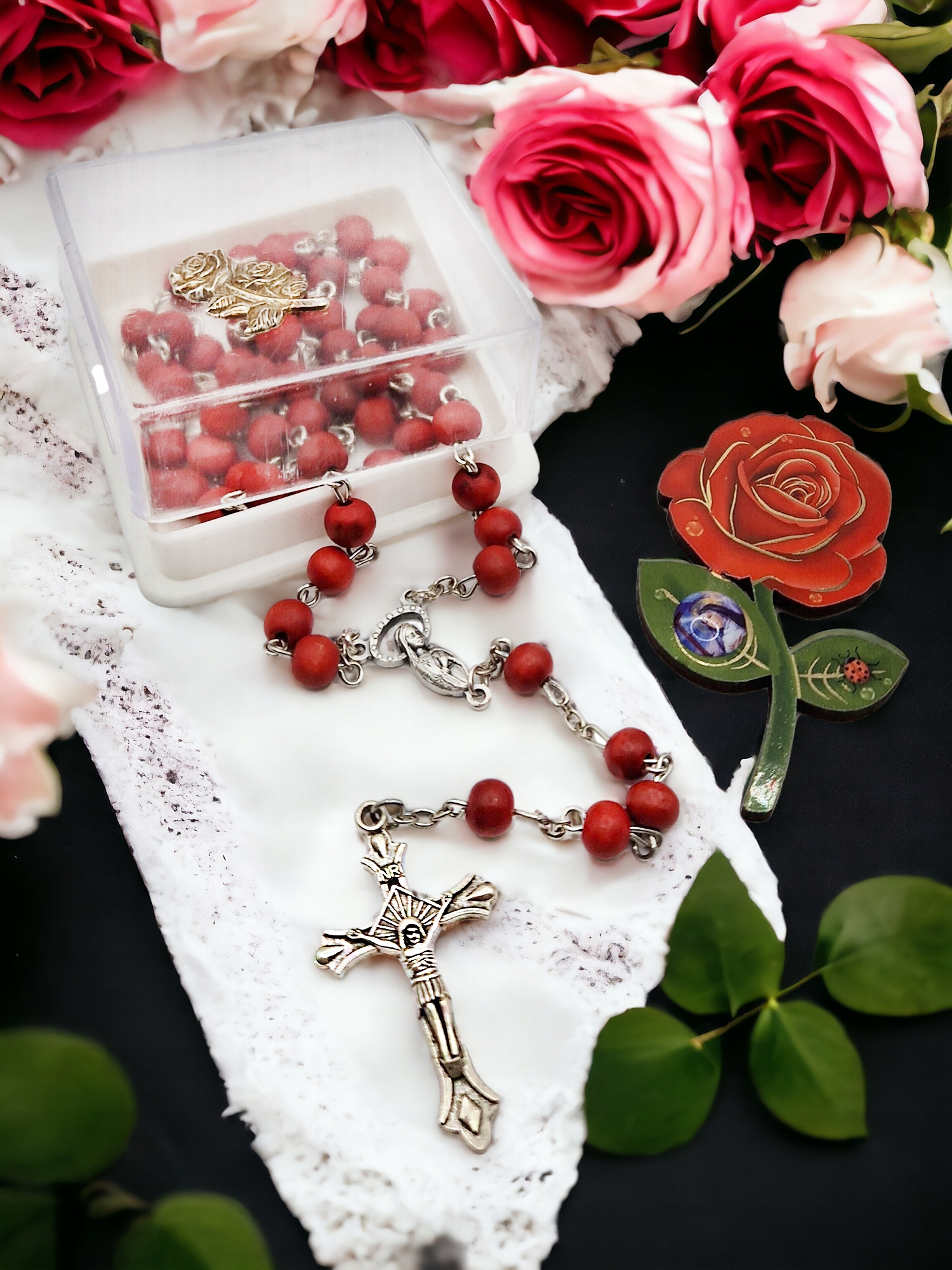 Представлена чотка вирізняється тонким ароматом троянди та має червоні намистини які виготовлені з дерева, а ланцюжок з хрестиком і з’єднувачем з металю, що гарантує естетичний вигляд і довговічність на роки.