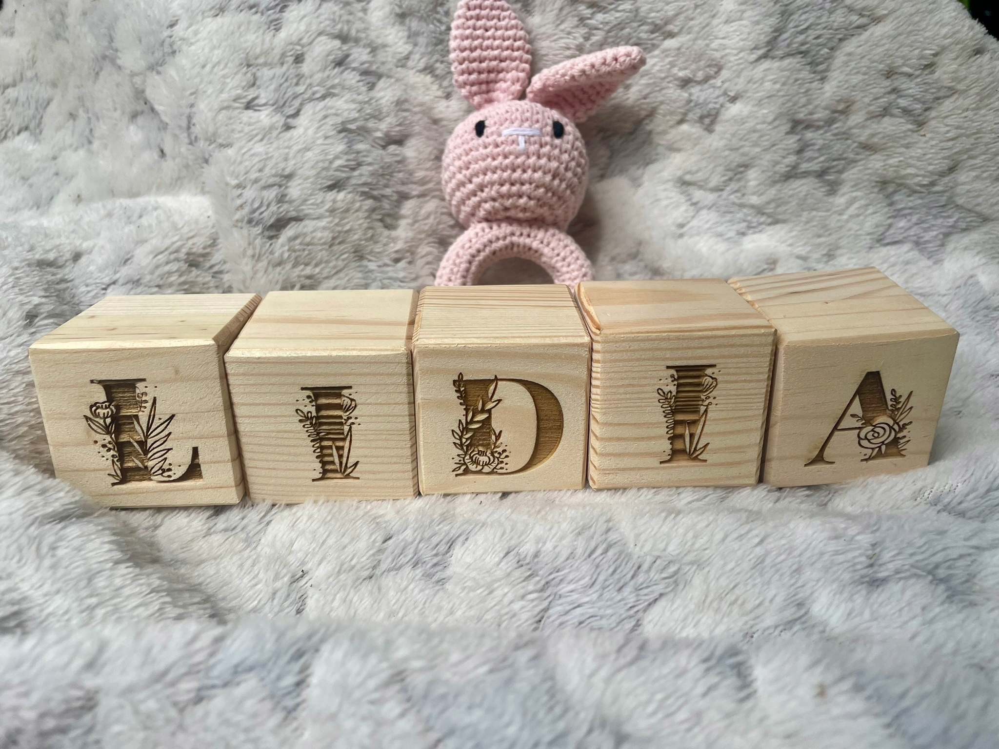 Дерев'яні кубики з квітами з гравіюванням будь-якої літери вашої дитини стануть чарівним доповненням до кімнати. Помістіть їх на полицю або комод, щоб красиво прикрасити інтер'єр. Вони також підійдуть як реквізит під час дитячої фотосесії, наприклад, для 12 фотографій першого року життя дитини.
