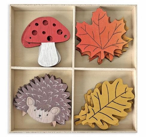 набір дерев’яних форм з осінніми мотивами серед які ви знайдете чарівні їжаки, гриби з дірками та листям Клен і дуб. Всі елементи пофарбовані і не потребують додаткова прикраса. Ці деревні форми - чудове доповнення для творчих дитячих проектів, пов'язаних з Leśna Природа та осінь, такі як коробки для іграшок І дрібні речі, фотографії, гірлянди або віконні прикраси. Також ідеально підходить для скрапбукінгу та декору домашнього декору серед інших обкладинок декоративних альбомів, подарункова упаковка, Осінні вінки та очерет. Кількість елементів у Упаковка: 16 ПК (4 х 4 форми) Розміри упаковки: 16 х 16 СМ розміри окремих елементів: - гриб; 6,3 х 5,8 см - дубовий лист; 7,7 х 5 см - кленовий лист; 6,5 х 6,5 см - їжак; 7,5 х 6,2 см Матеріал: Колір деревини: багатобарвна
