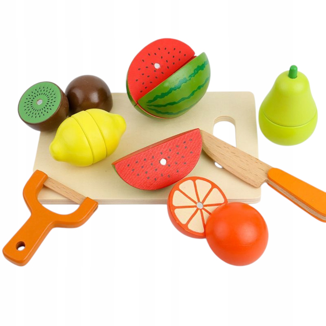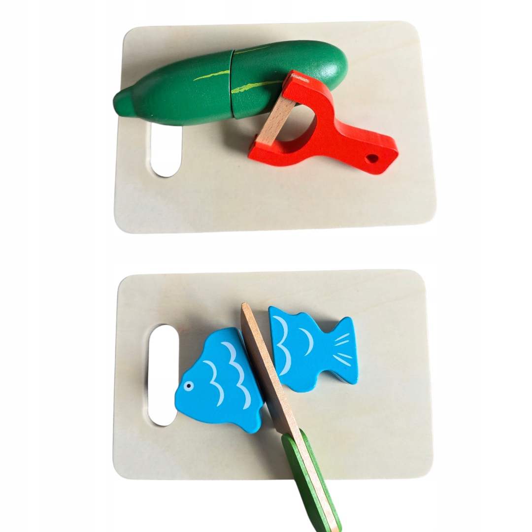 - ✅ Набір містить 17 елементів: овочі, фрукти, риба + ножі, дошка, очисник