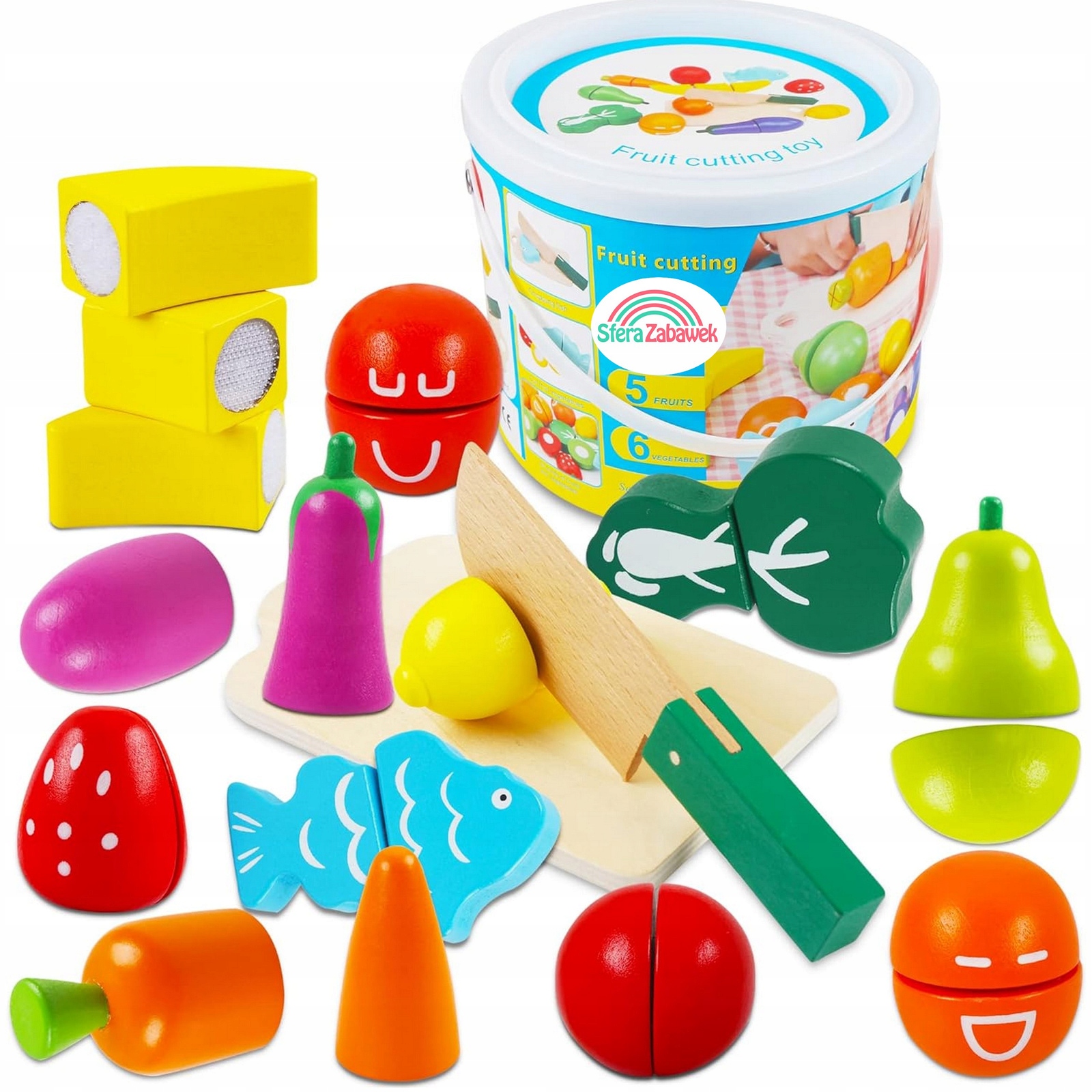 елемент опис Обробна дошка Якісна деревина, міцна та естетична Різальний ніж Безпечний для дітей, ідеально підігнаний Фрукти та овочі Апельсин (2 шт.), Банан, Полуниця, Груша, Лимон, Помідор, Морква, Баклажан, Брокколі Відро Практичне відерце з ручкою для зберігання набору