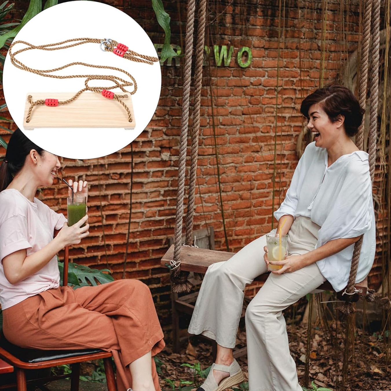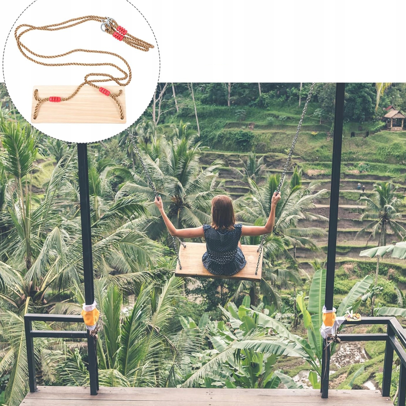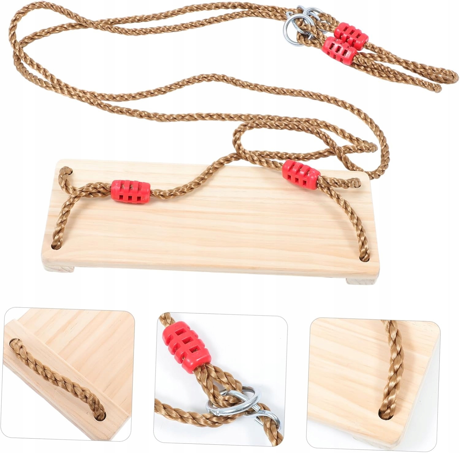 Дерев'яне сидіння гойдалки виготовлено з товстої березової деревини, металевих кілець і товстої джутової мотузки, що забезпечує додаткову міцність і комфорт. Зберігає первинний колір дерева, естетичність і натуральність.