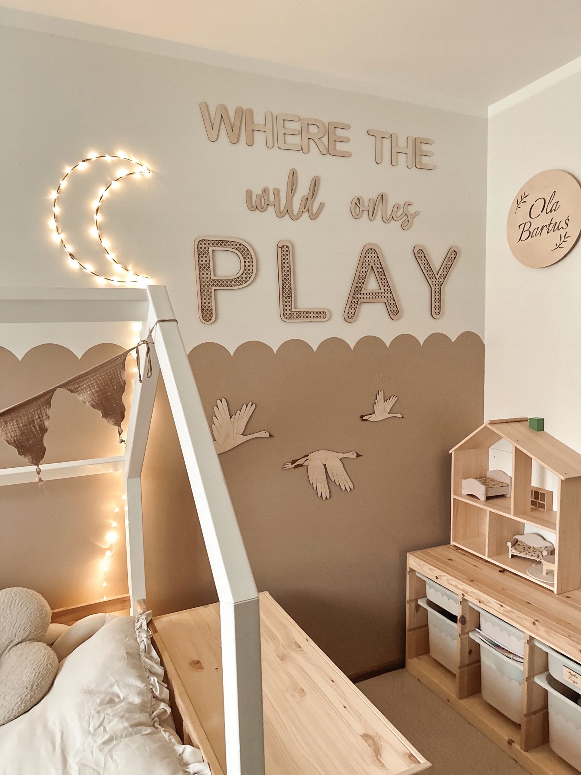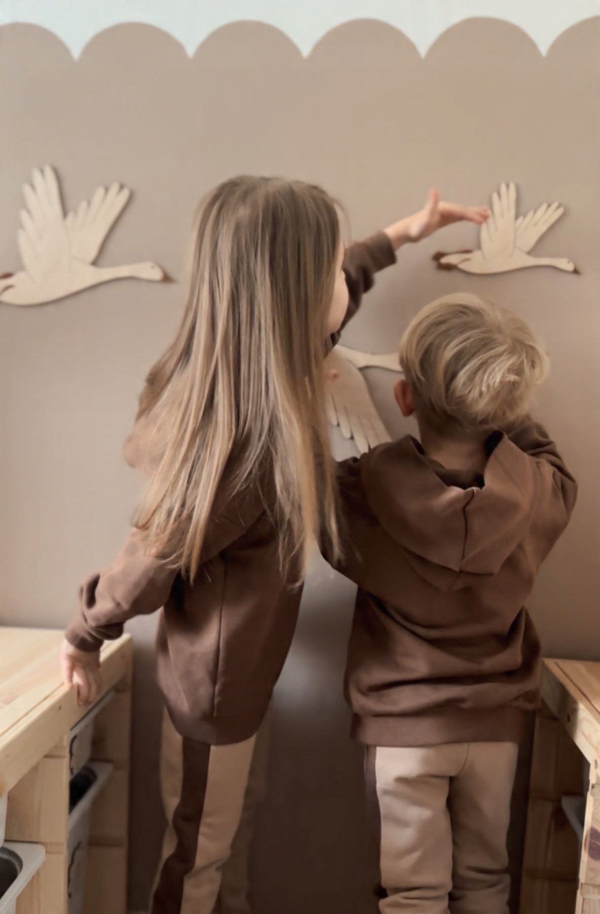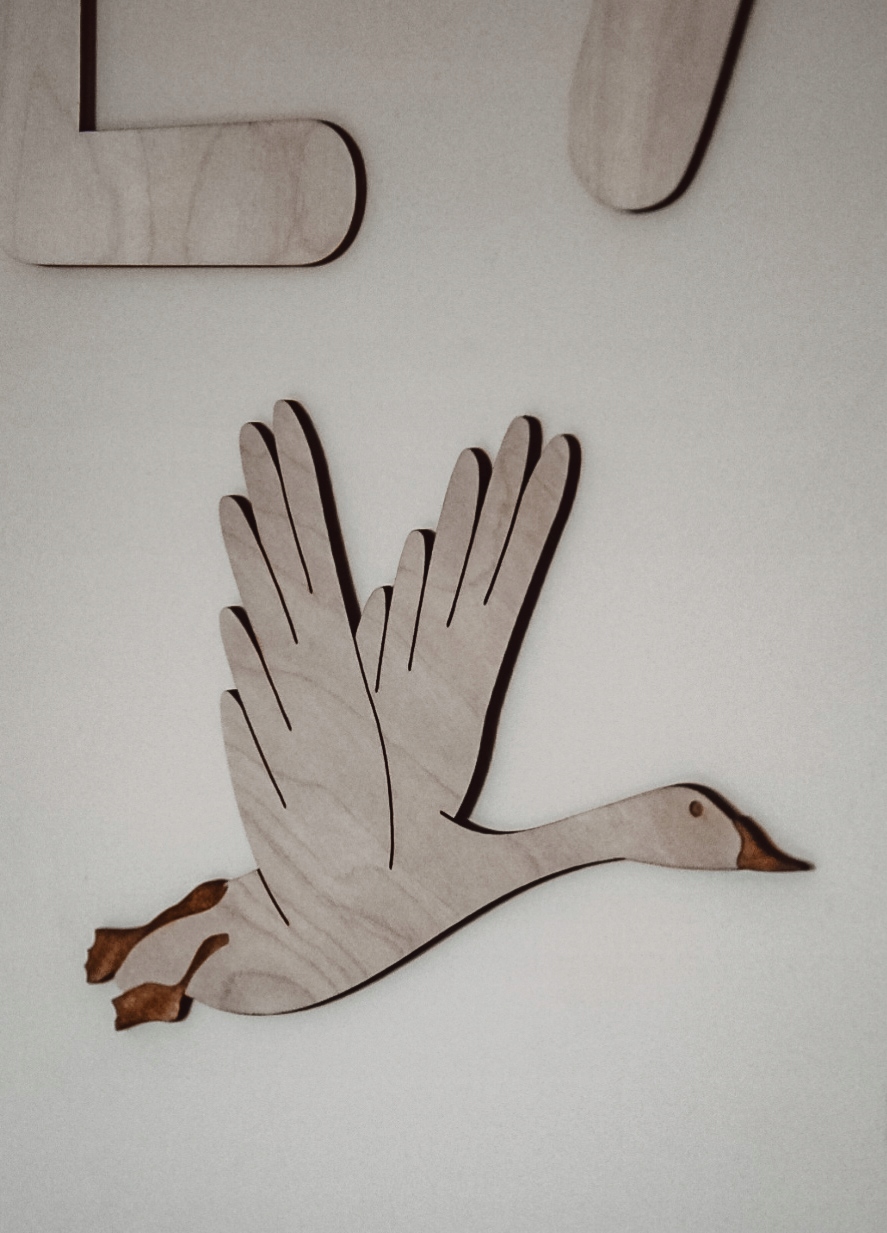 Догляд за дитячою кімнатою з унікальною прикрасою! Дерев’яні гуси з ефектом гравюри - це елегантне та природне прикраса стінок, що введе тепло та гармонію в інтер’єр. Їх делікатний дизайн означає, що вони підходять як до кімнати дитини, так і старшої дитини. Створіть чарівну атмосферу!