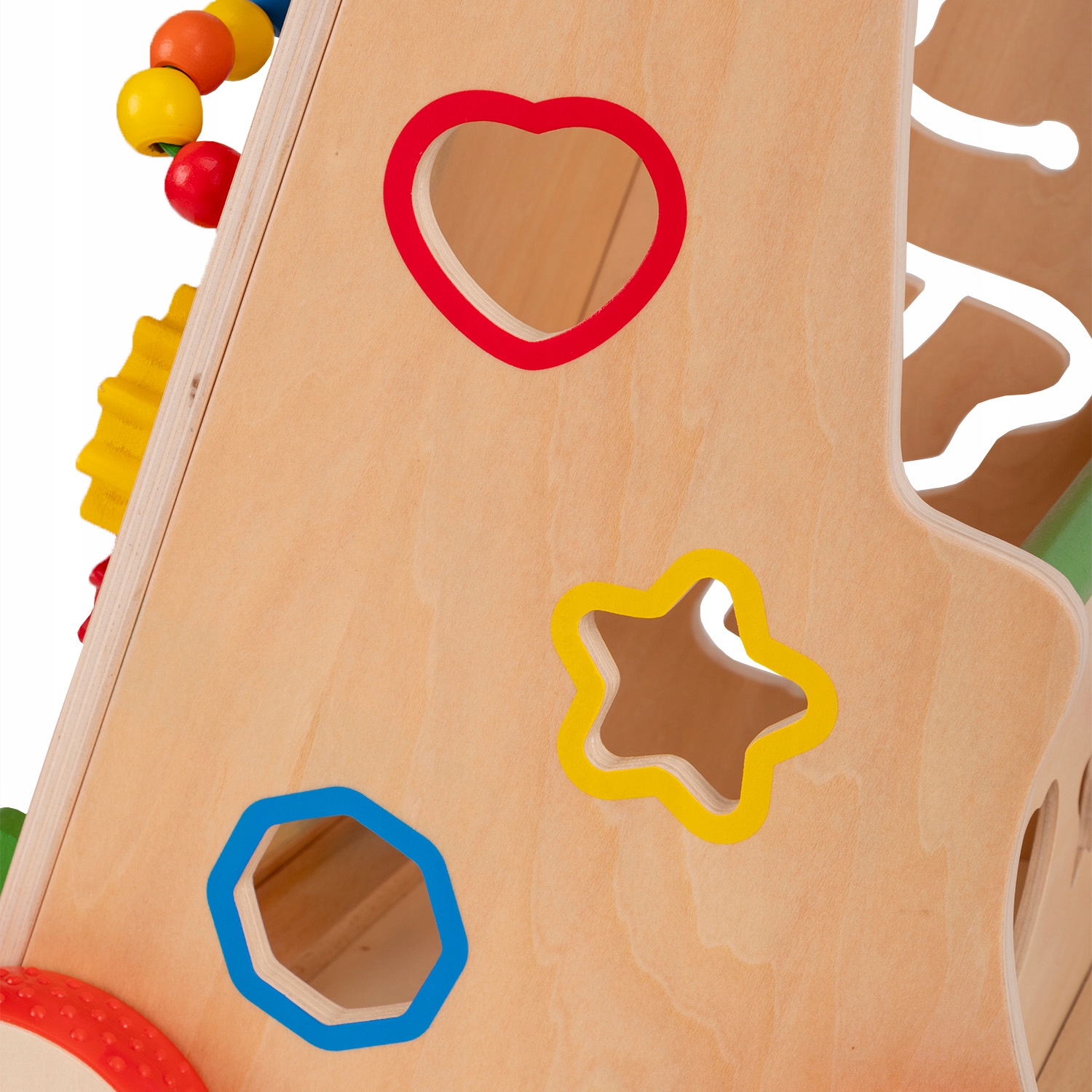 Ходунки-стійки - це іграшка, яка супроводжує дитину під час перших кроків, а також навчальна розважальний центр, що розвиває моторику дитини. Кожна зі стінок пушера має абсолютно різну функціональність і характер. Це дозволяє проводити дуже цікаву гру, яка ніколи не набридне та стимулюватиме розвиток малюка: рахівниця та тарілки, лабіринт, рухомі кульки та гвинтики, дзеркало та рухомий пазл. Ходунки також виконують функцію контейнера для іграшок, а завдяки сітці речі захищені від випадання. Має протиковзкі колеса. Іграшка виготовлена з сертифікованої високоякісної деревини, повністю безпечна, покрита нетоксичною фарбою. Варіант із регульованою ручкою дозволяє підлаштувати ходунки під зріст дитини.