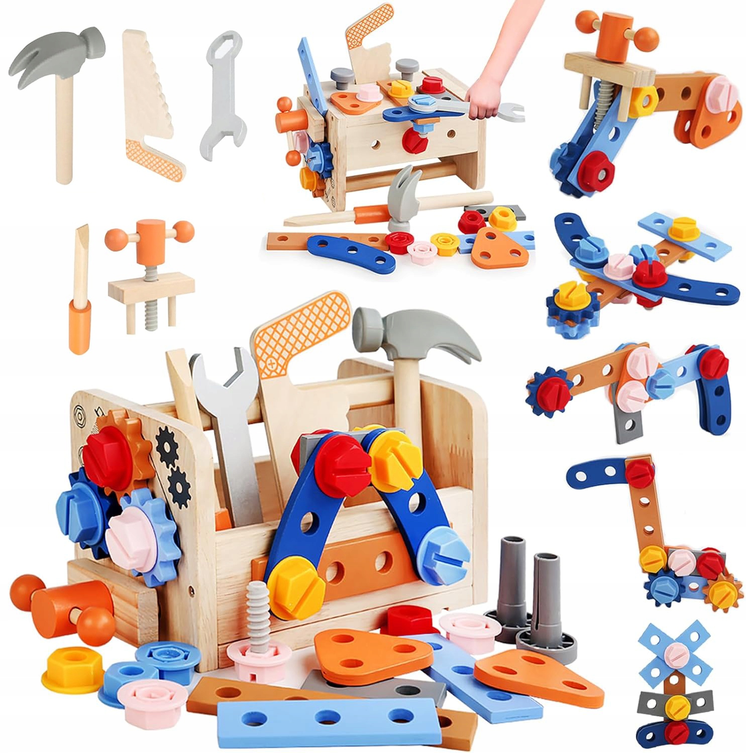 Усі інструменти виготовлені з натуральної деревини, що робить їх екологічно чистими. Барвисті елементи привертають увагу та заохочують задоволення. Коробка легка і проста в перенесенні, щоб ви могли взяти його з собою всюди. Це прекрасний спосіб провести час на свіжому повітрі або на домашній майстерні.
