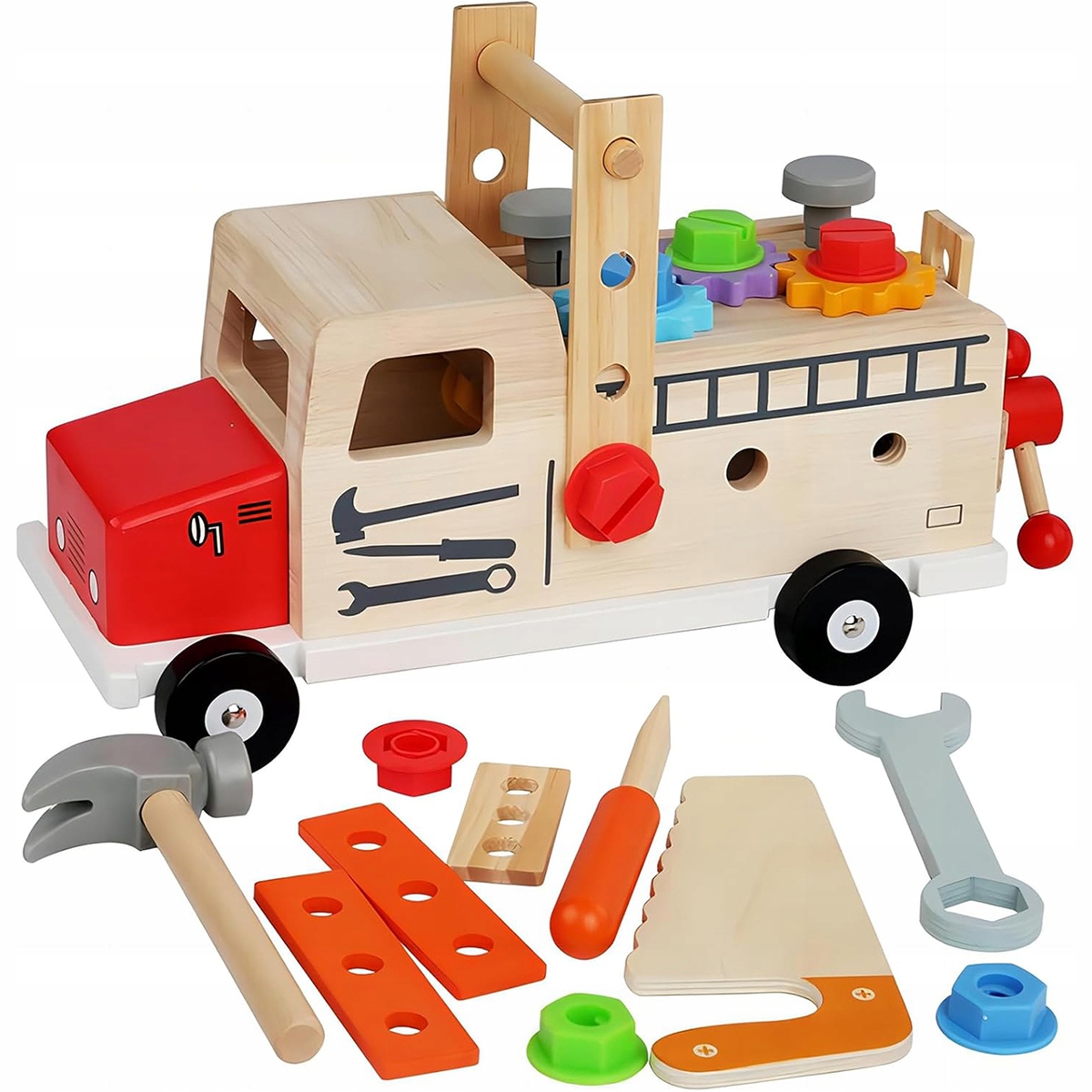 Наш набір інструментів для малюків містить 1 коробку інструментів, 1 пила, 1 молоток, 1 клавіша, 1 викрутка, 1 ручка, 1 обертова ручка, 1 будівельний блок, 3 передачі, 5 гвинтів, 2 цвяхи, 5 гайок, 1 мотузка, 6 елементів дизайну, 1 конструкція 1 Колонкісна карта. Яскраві кольори та різноманітність цього дерев’яного інструменту зробить вашу дитину великою радістю під час гри з будівельними матеріалами.