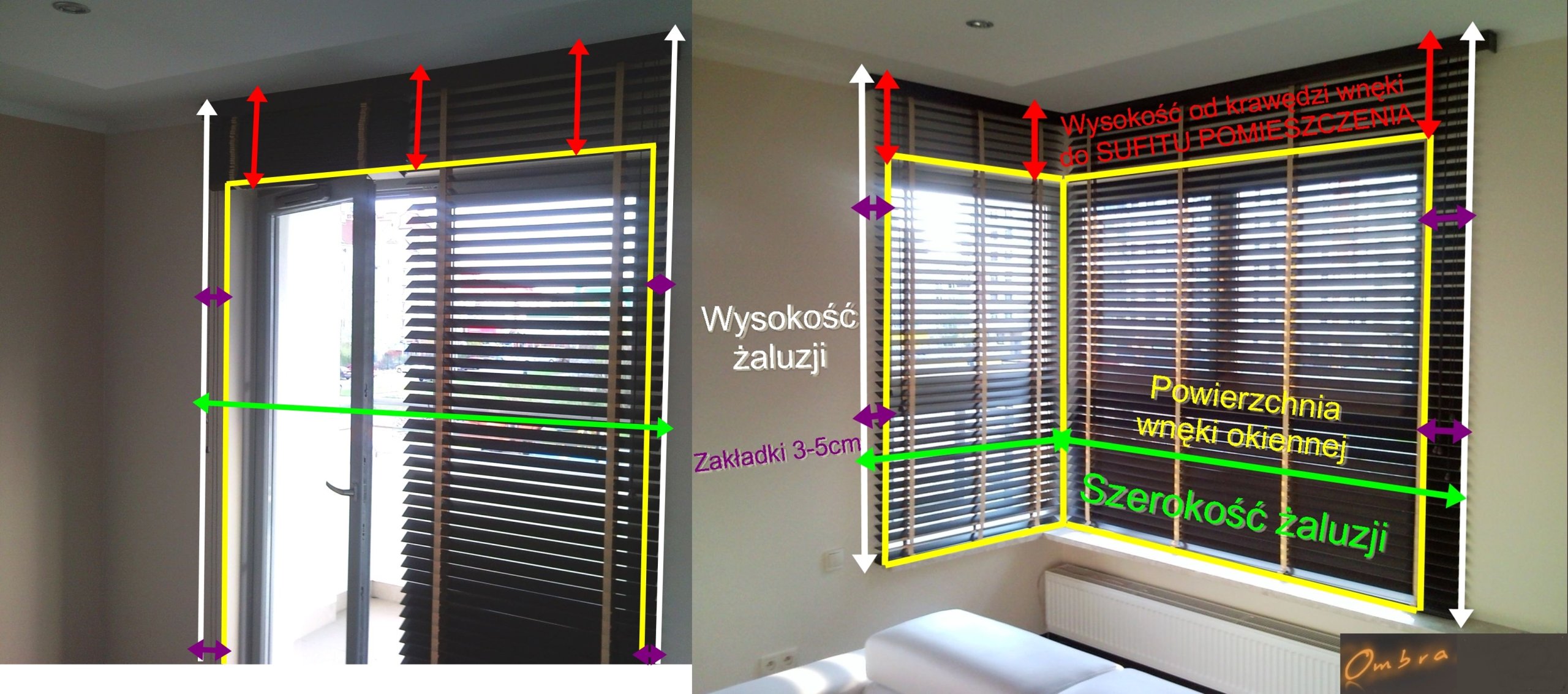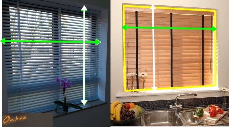 ШИРИНА БЛОКА – (позначено зеленим кольором) – це ширина віконної ніші плюс нахлестки з обох боків жалюзі плюс 3-5 см (фіолетовий), тут немає особливого стандарту, воно повинно бути гарним і пропорційним.